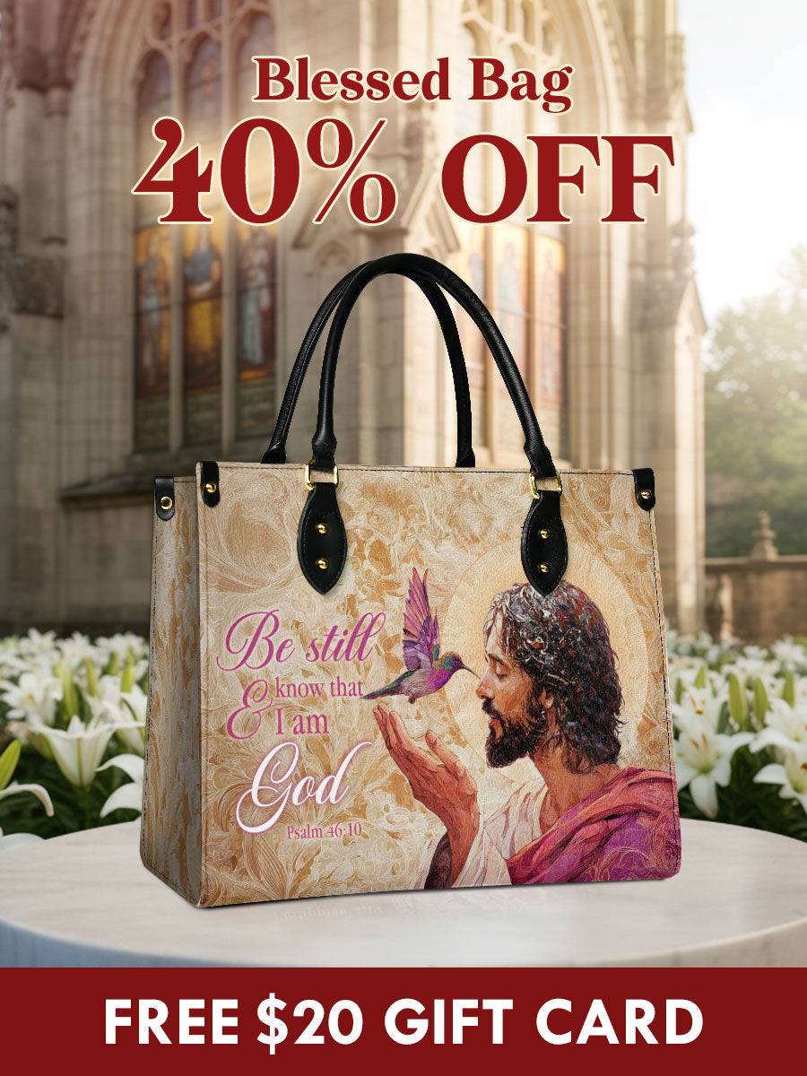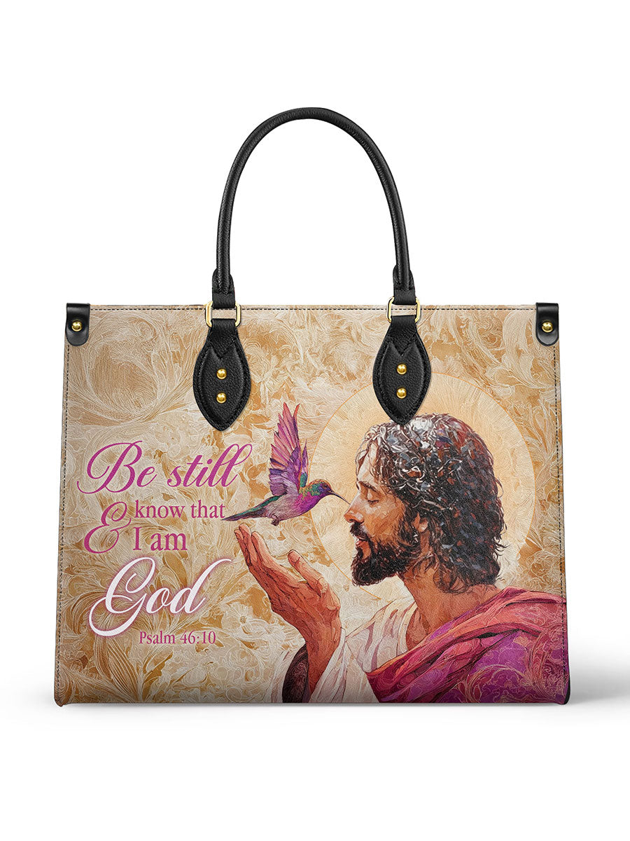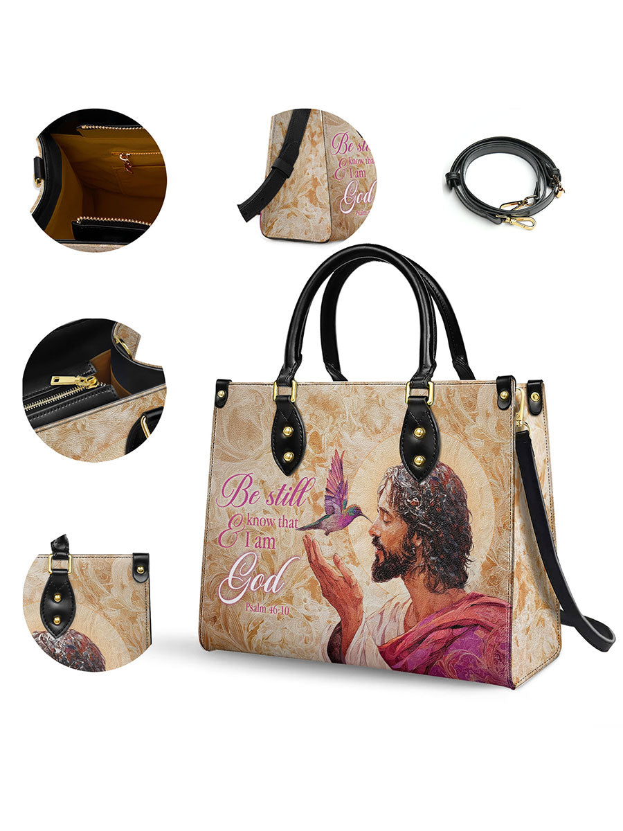 Soft tones, sacred imagery, and the timeless message from Psalm 46:10 make this tote a gentle companion for prayer, reflection, and daily life. Every detail from the radiant background to the reverent pose of Christ - whispers of peace and trust in God’s guidance.