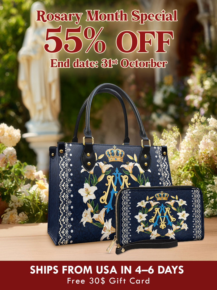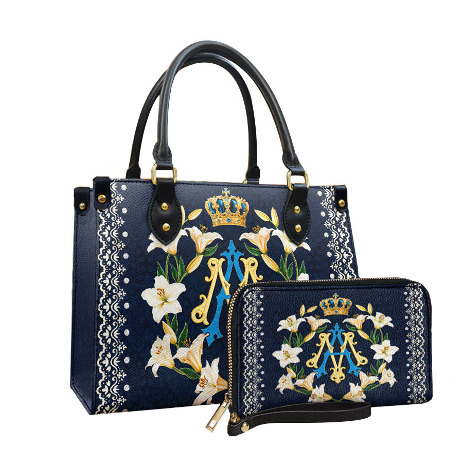 The structured handbag pairs elegance with function, while the matching wallet keeps your essentials close — both honoring the beauty of faith in every detail.