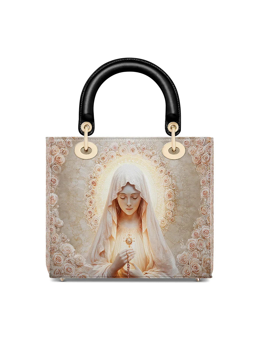 This exquisite leather bag radiates serenity and devotion, featuring a breathtaking image of the Virgin Mary holding the Holy Eucharist and rosary. Encircled by a luminous halo of soft pink roses, the artwork symbolizes purity, faith, and divine love. The delicate rose accents blend seamlessly with the serene ivory and gold tones of the design, creating a masterpiece of elegance and spirituality.