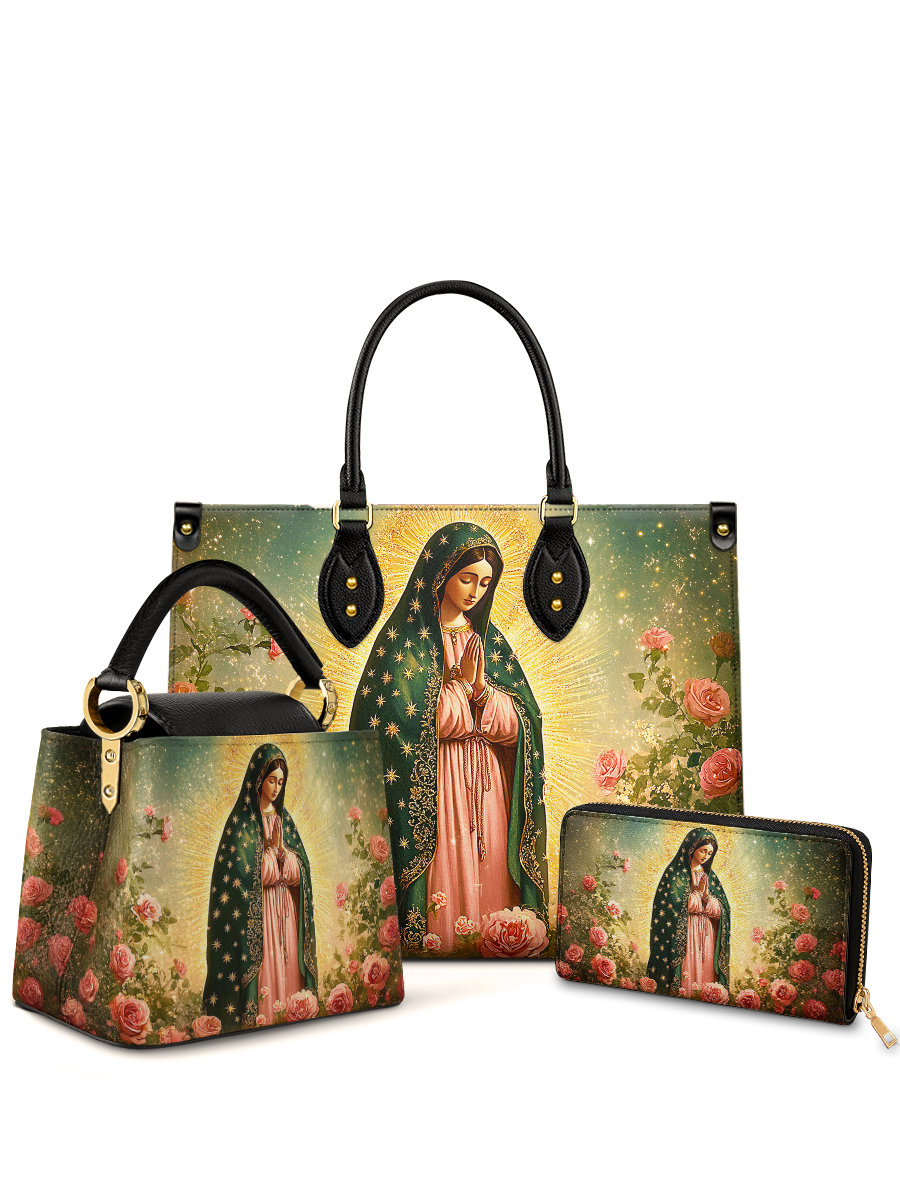 The Roses of Guadalupe Trio Bundle honors the Blessed Mother with her iconic mantle of stars, encircled by roses of heavenly beauty. A reminder of her tender intercession, this set reflects both elegance and devotion.