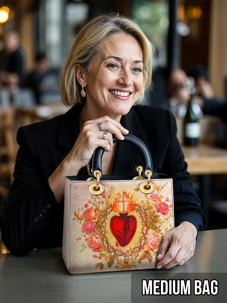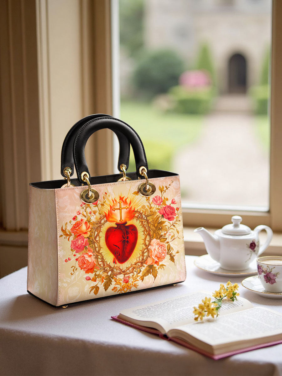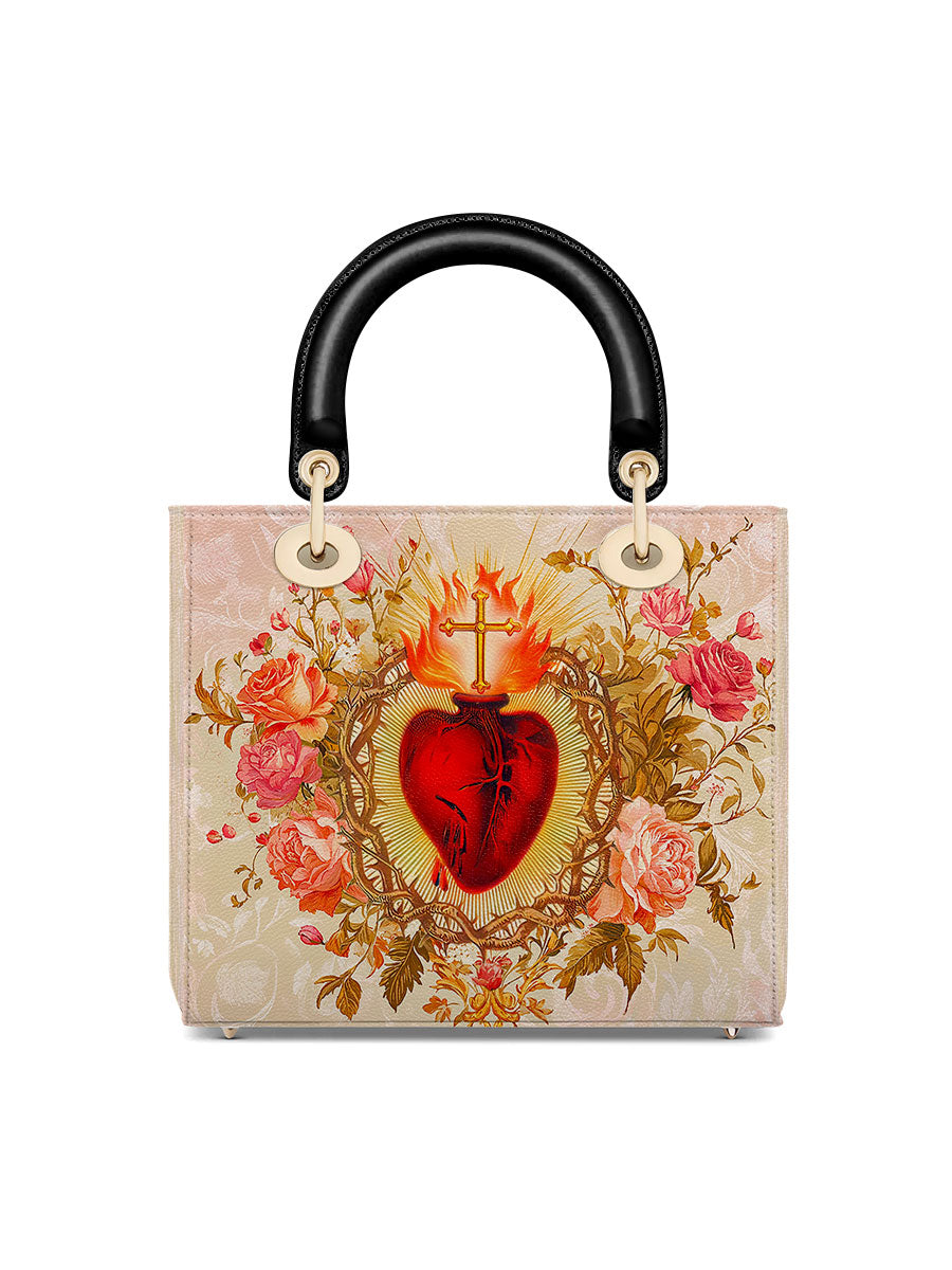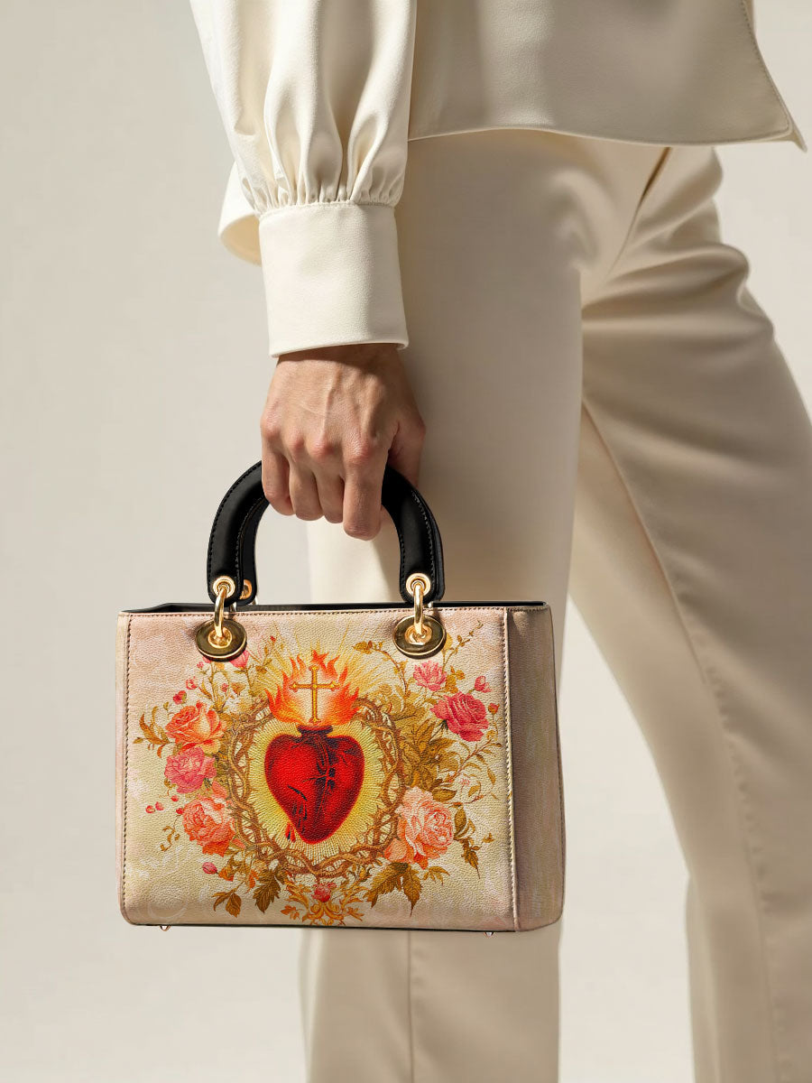 This Lady Leather Bag features a striking image of the Sacred Heart of Jesus, encircled by thorns and crowned with a radiant flame and cross—symbols of divine love, sacrifice, and mercy. The rich red heart glows with spiritual intensity, while the surrounding roses and golden leaves soften the composition with a touch of tenderness and devotion.