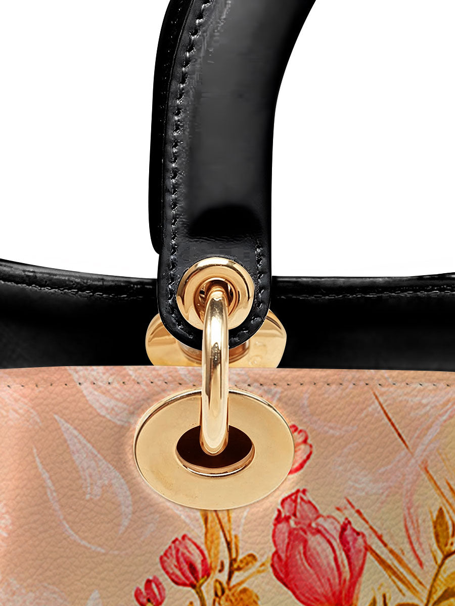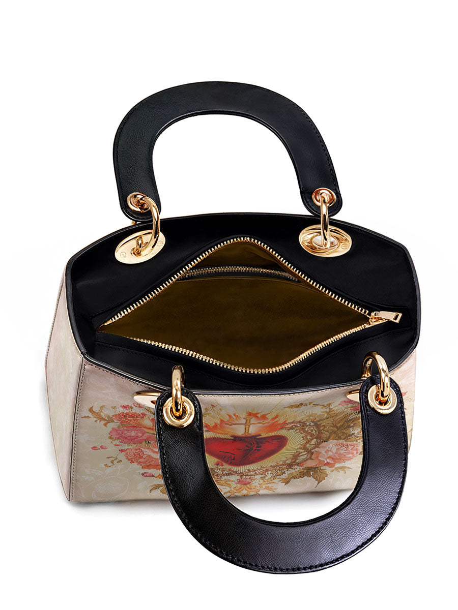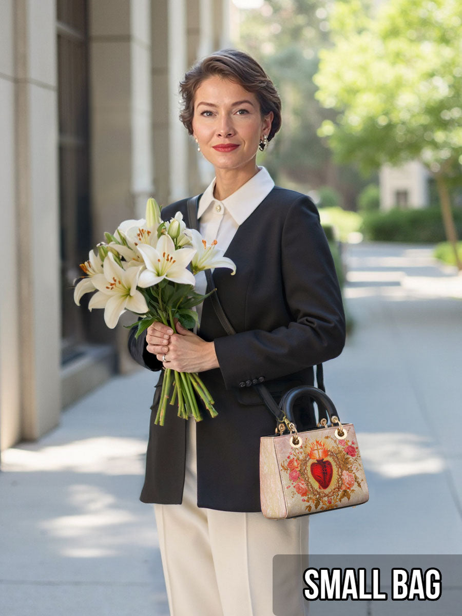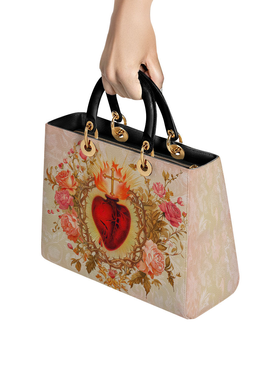 This Lady Leather Bag features a striking image of the Sacred Heart of Jesus, encircled by thorns and crowned with a radiant flame and cross—symbols of divine love, sacrifice, and mercy. The rich red heart glows with spiritual intensity, while the surrounding roses and golden leaves soften the composition with a touch of tenderness and devotion.