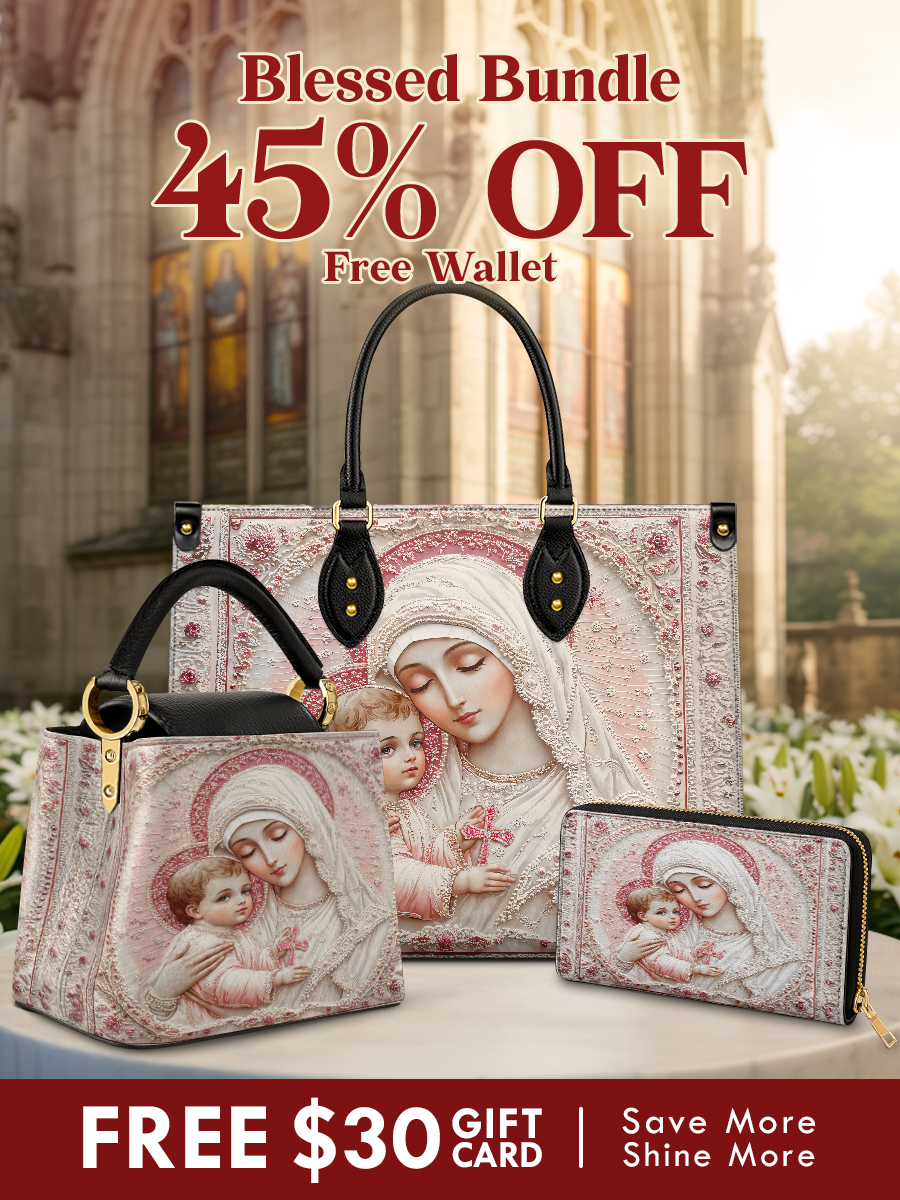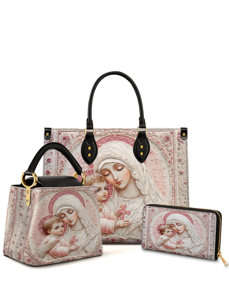 This trio includes a spacious handbag, a graceful satchel bag, and a free wallet — blending practicality with reverence. Perfect for women who wish to carry not only their essentials but also a daily reminder of divine love and serenity.