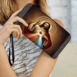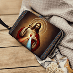 This exquisite leather wallet purse features the radiant image of Jesus, His Sacred Heart emanating divine rays of red and blue light symbolizing love and mercy. The intricate artwork is bordered by delicate embroidery patterns, adding an extra layer of refinement and devotion to its design.
