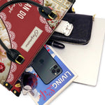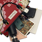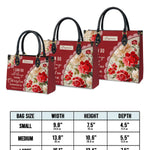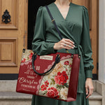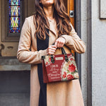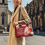 This beautifully designed leather bag features the empowering Bible verse “I can do all things through Christ who strengthens me” from Philippians 4:13. Set against a rich crimson backdrop, the verse is framed by delicate lace accents and vibrant floral motifs, including bold red roses that symbolize love, strength, and faith. A subtle cross and personalized name detail add a meaningful and personal touch to this elegant and spiritually uplifting design.