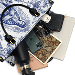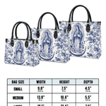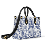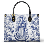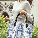 The Sacred Serenity Virgin Mary Leather Bag is a beautifully designed handbag that combines faith, elegance, and artistry. Made from premium leather, this tote features a classic blue-and-white toile pattern adorned with a graceful depiction of the Virgin Mary, symbolizing peace and devotion. The structured silhouette, accented with gold-tone hardware and black leather handles, adds a touch of sophistication. Designed for both style and functionality, this bag is perfect for those who want to carry their faith with them in a refined and fashionable way.