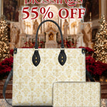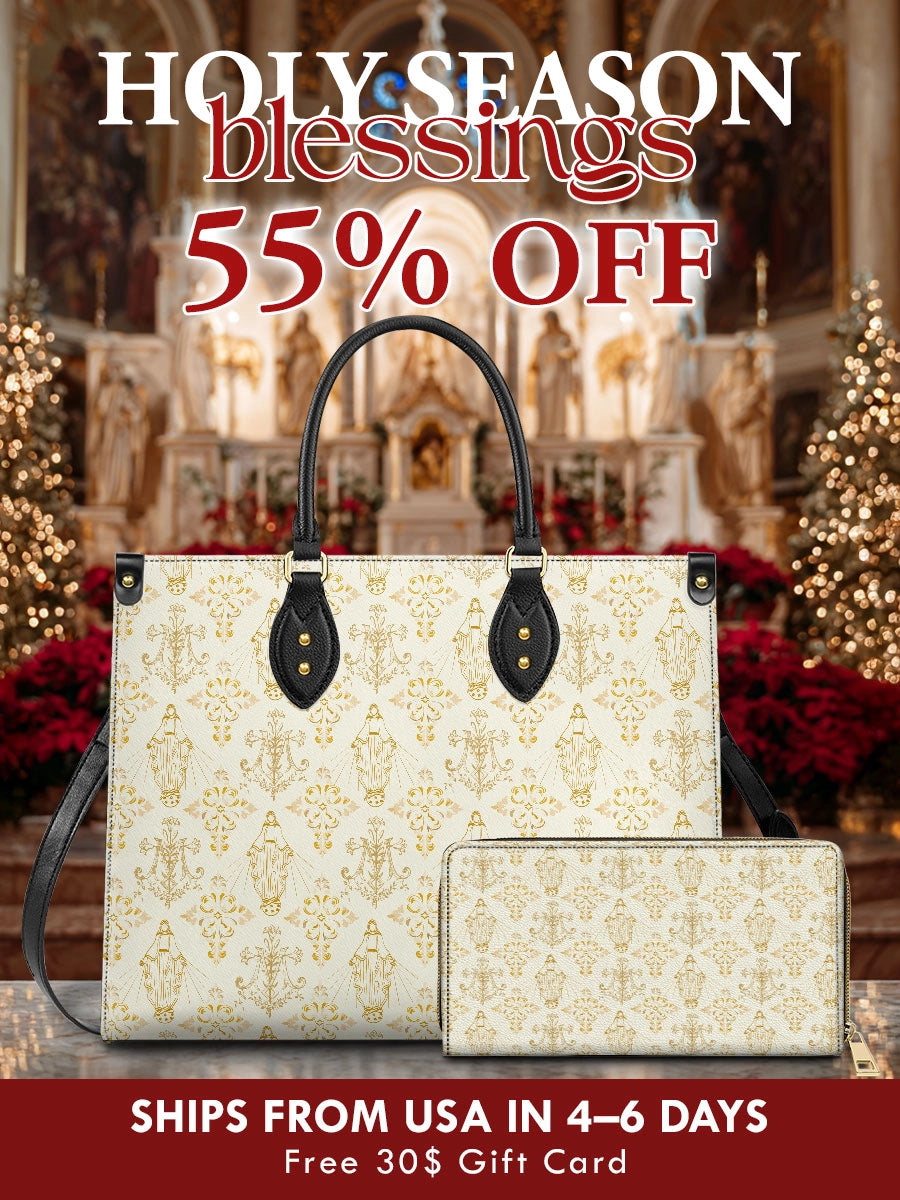 The structured handbag provides timeless form and function, while the matching wallet keeps your essentials close — both crafted to reflect the beauty of devotion in everyday life.