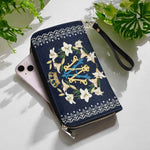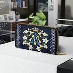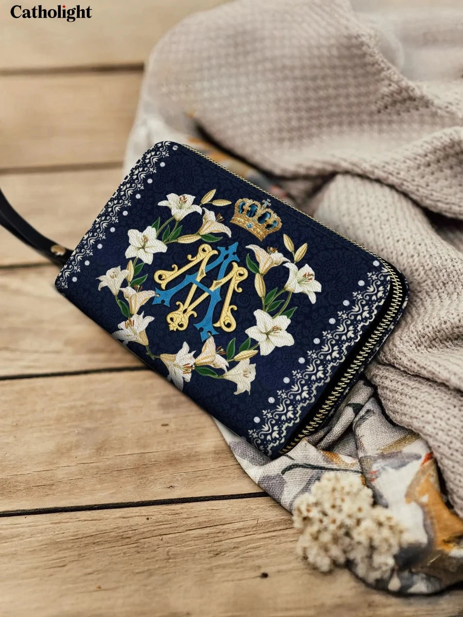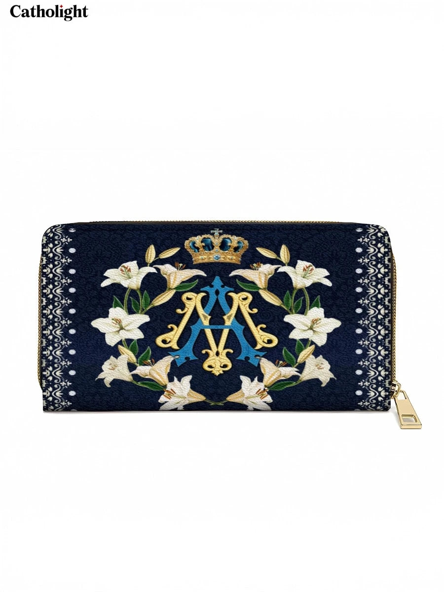This elegant wallet celebrates the Marian symbol with a regal and graceful design. At its center, the intertwined “A” and “M” monogram, representing Ave Maria, is rendered in gold and blue, symbolizing devotion and purity. Surrounding the monogram is a wreath of delicate white lilies, signifying the Virgin Mary's holiness and purity. A golden crown rests above, embodying her queenship, while intricate lace-like borders add a touch of timeless refinement against the deep navy blue background.