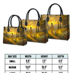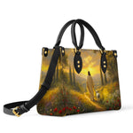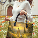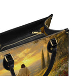 This stunning leather bag features a serene and inspiring depiction of Jesus as the Good Shepherd, walking through a golden meadow at sunset with a lamb by His side. The radiant golden light bathes the landscape, symbolizing divine guidance, hope, and the promise of peace. The vibrant wildflowers and lush greenery surrounding the path create a sense of harmony and connection to God’s creation, while the figure of Jesus exudes compassion and reassurance. This artwork beautifully captures the essence of Christ’s love and His role as the protector and guide for all who follow Him.