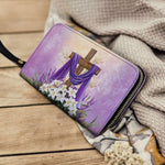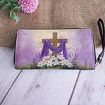 This graceful wallet showcases the Cross surrounded by white lilies and lavender flowers, set against a serene purple background. The flowing purple cloth draped over the Cross symbolizes Christ’s sacrifice and the hope of resurrection, while the lilies reflect purity and new life.