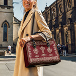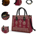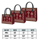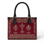 This luxurious leather bag features a deep crimson background adorned with intricate golden designs centered on a beautifully detailed cross. The cross, symbolizing faith, redemption, and divine grace, is surrounded by sacred Christian motifs and delicate floral accents, creating a timeless and meaningful representation of devotion. The rich combination of colors and patterns evokes reverence and the enduring beauty of faith.