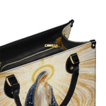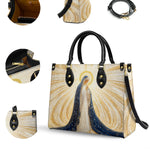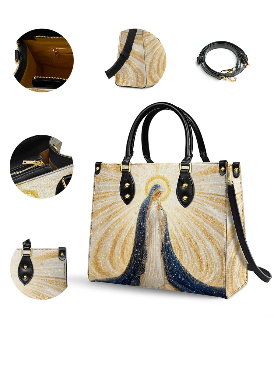This exquisite leather bag showcases a breathtaking image of the Blessed Virgin Mary, surrounded by radiant beams of divine light. Her flowing deep blue veil, adorned with shimmering golden accents, symbolizes purity, grace, and her role as the Queen of Heaven. The artwork exudes spiritual beauty, with the luminous rays representing hope, faith, and God’s guiding presence. Crafted with premium leather, this bag blends timeless elegance with meaningful devotion.
