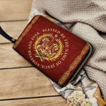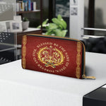 This beautifully crafted wallet highlights the sacred monogram "IHS," representing the Holy Name of Jesus, encircled by a golden wreath and delicate floral accents. The words “Blessed be the Name of Jesus, forever and ever” add a heartfelt expression of devotion, while the deep crimson and gold design evokes timeless beauty and faith.