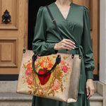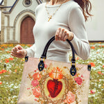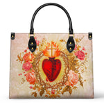 This elegant leather bag features a striking depiction of the Sacred Heart of Jesus, surrounded by vibrant roses and framed with intricate golden details. The Sacred Heart, crowned with flames and a cross, symbolizes Christ’s divine love, sacrifice, and compassion for humanity. The soft pastel tones of the background and the vibrant flowers create a harmonious design, evoking a sense of peace, faith, and spiritual connection. This leather bag is a beautiful representation of devotion and love for Christ.