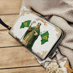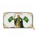 This striking wallet celebrates the legacy of Saint Patrick, the beloved patron saint of Ireland, with a design that radiates faith, courage, and heritage. At the center stands Saint Patrick, clothed in resplendent green robes adorned with intricate golden details, symbolizing his role as a spiritual leader. In his hands, he holds a crosier and a shamrock, representing the Trinity and his teachings of faith.