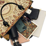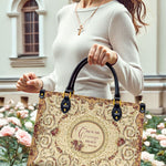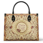 This elegant leather bag features the inspiring biblical verse “Rise up, take courage, and do it” from Ezra 10:4. The verse is beautifully framed within an ornate medallion surrounded by intricate floral patterns in warm gold and deep red tones, symbolizing strength, determination, and faith. The design radiates timeless grace, offering a powerful reminder of God’s call to act with courage and confidence in His guidance.