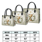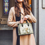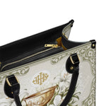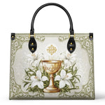 This beautifully designed leatherbag celebrates the sacred mystery of the Eucharist, featuring a central golden chalice adorned with intricate detailing that symbolizes the Holy Communion. The chalice is surrounded by radiant white lilies, representing purity, grace, and the divine presence, all set against a serene and elegant background of soft ivory and green tones with delicate ornate patterns.