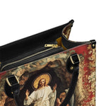 This beautifully crafted leatherbag depicts the triumphant resurrection of Jesus Christ, emerging from the tomb in a radiant display of divine glory. Jesus stands at the center, clothed in resplendent white robes that signify purity and victory over death. His hands are raised in blessing, while a golden halo encircles his head, symbolizing his divinity and the light of salvation.