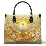 This striking leather bag features a radiant depiction of the Holy Spirit in the form of a dove, surrounded by a heavenly glow and intricate floral detailing. The golden aura symbolizes divine light, peace, and the guidance of the Holy Spirit, while the delicate white flowers evoke purity and grace. The artwork exudes spiritual elegance, inspiring faith and a deep sense of connection to the divine. Crafted with care, this leather bag beautifully captures the essence of devotion and the presence of the Holy Spirit in daily life.
