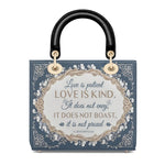 The bag beautifully celebrates the enduring message of love and virtue from 1 Corinthians 13:4. Adorned with the heartfelt words "Love is patient, Love is kind," encased in a delicate floral frame and ornate design, this bag radiates grace, faith, and timeless beauty. Its harmonious color scheme adds a touch of elegance, making it both meaningful and fashionable.