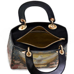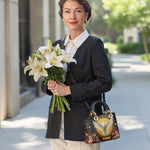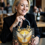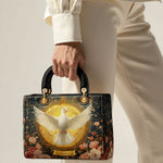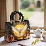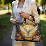 This Lady Leather Bag features a graceful image of the Holy Spirit in the form of a white dove, gently emerging from an ornate golden frame surrounded by lush roses. Set against a rich midnight-blue background, the composition radiates a sense of sacred peace, beauty, and divine presence. The floral base adds softness and warmth, symbolizing the Spirit’s nurturing guidance in the life of faith.
