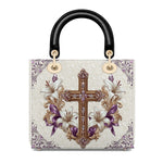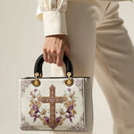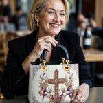 This elegant bag showcases a breathtaking design centered around a radiant jeweled cross, adorned with intricate details and surrounded by graceful white lilies. The cross, a timeless symbol of faith and redemption, shines with ornate embellishments, while the lilies evoke purity, hope, and the promise of renewal. Together, they create a powerful image of spiritual grace and divine elegance.