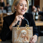 This exquisite leather bag showcases a breathtaking depiction of the Madonna and Child, embodying purity, love, and divine grace. Encircled by an ornate golden halo encrusted with pearls, the Virgin Mary's serene expression and gentle embrace of the Christ Child exude maternal devotion and heavenly protection.