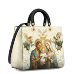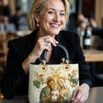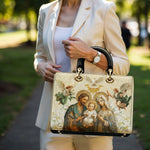This exquisite leather bag features a beautiful rendering of the Holy Family—Jesus, Mary, and Joseph—surrounded by angels and delicate lilies. The rich symbolism and peaceful colors evoke a sense of divine love, protection, and unity. The radiant, ethereal atmosphere of the artwork invites feelings of serenity and hope, making it a perfect reminder of the Holy Family’s sacred bond.