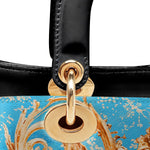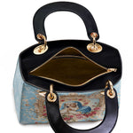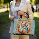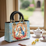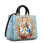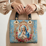 This Lady Leather Bag features a graceful depiction of the Blessed Virgin Mary, hands folded in prayer and crowned with delicate gold accents. She is framed by an ornate floral arch of roses and surrounded by soft patterns on a sky-blue background, creating an atmosphere of serenity and sacred elegance. Her gentle gaze and flowing blue veil reflect purity, peace, and divine love.