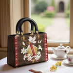 This leather bag showcases an elegant and symbolic design, featuring a beautifully detailed bishop's mitre surrounded by blooming white lilies, signifying purity and divine devotion. A radiant dove, representing the Holy Spirit, gracefully rests above the mitre, symbolizing peace, guidance, and spiritual blessings. The intricate golden embroidery and ornate red accents evoke a sense of reverence and majesty, making this bag a stunning tribute to the sacred traditions of faith.