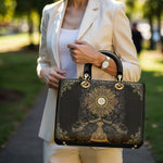 This sophisticated leather bag showcases a magnificent depiction of the sacred monstrance, adorned with radiant golden rays and intricate detailing that honors the divine presence in the Eucharist. Surrounded by delicate floral designs and angelic motifs, the artwork beautifully embodies the reverence and splendor of the Corpus Christi tradition. The deep black background enhances the brilliance of the gold accents, creating a striking and spiritual design.