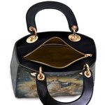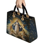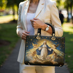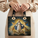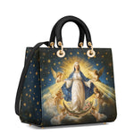 This Lady Leather Bag features a radiant portrayal of the Blessed Virgin Mary, crowned with stars and standing gracefully upon a crescent moon. Surrounded by golden light and four adoring angels, she appears as Queen of Heaven, clothed in flowing robes of white and blue that symbolize purity, peace, and divine motherhood. The star-filled sky evokes a sense of celestial wonder and heavenly protection.