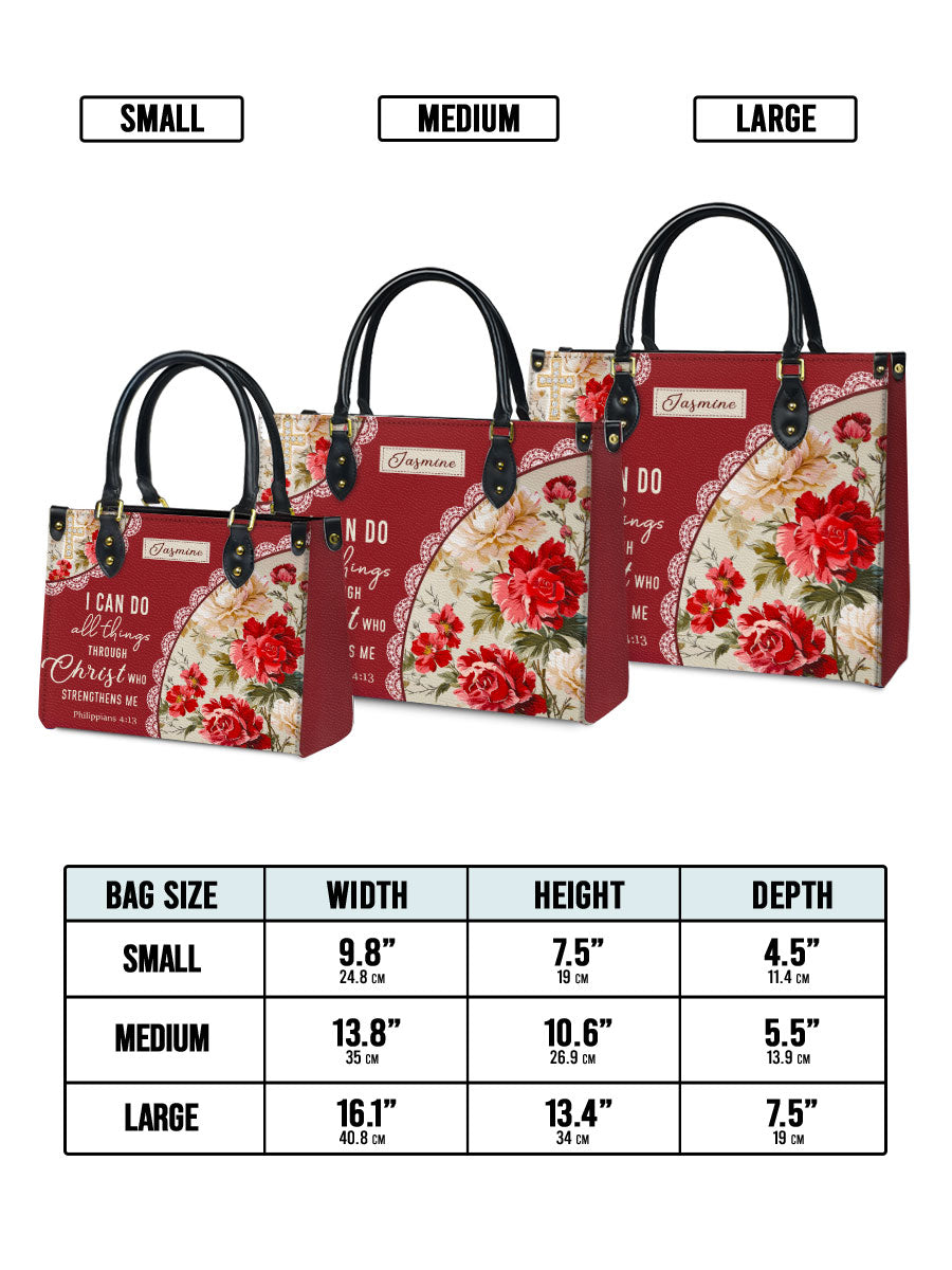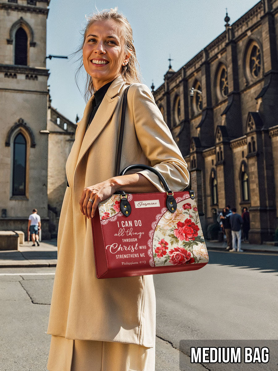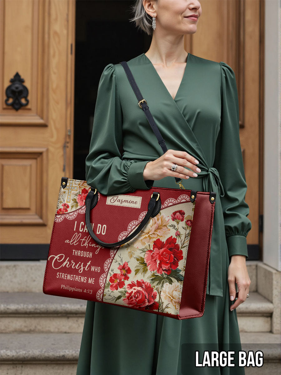 This beautifully designed leather bag features the empowering Bible verse “I can do all things through Christ who strengthens me” from Philippians 4:13. Set against a rich crimson backdrop, the verse is framed by delicate lace accents and vibrant floral motifs, including bold red roses that symbolize love, strength, and faith. A subtle cross and personalized name detail add a meaningful and personal touch to this elegant and spiritually uplifting design.