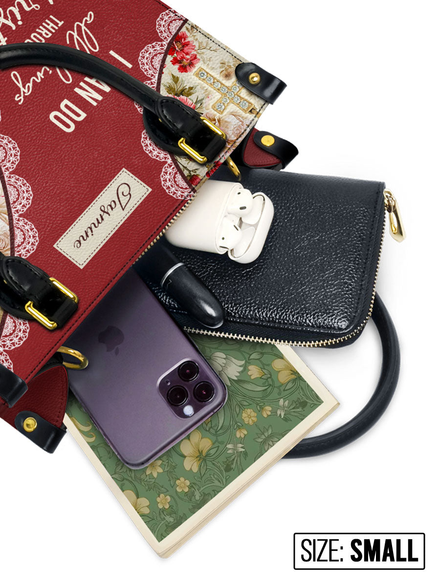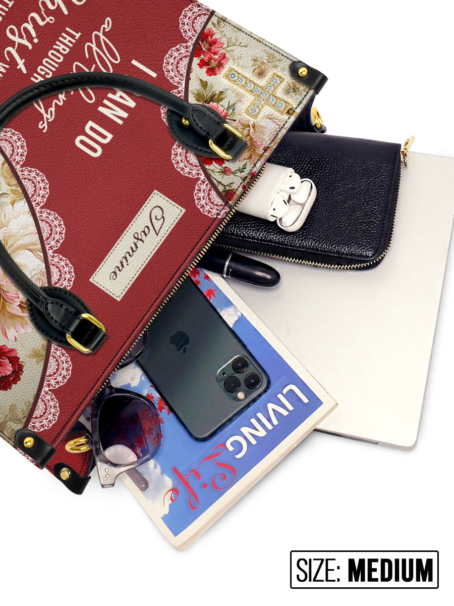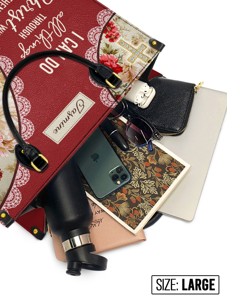 This beautifully designed leather bag features the empowering Bible verse “I can do all things through Christ who strengthens me” from Philippians 4:13. Set against a rich crimson backdrop, the verse is framed by delicate lace accents and vibrant floral motifs, including bold red roses that symbolize love, strength, and faith. A subtle cross and personalized name detail add a meaningful and personal touch to this elegant and spiritually uplifting design.