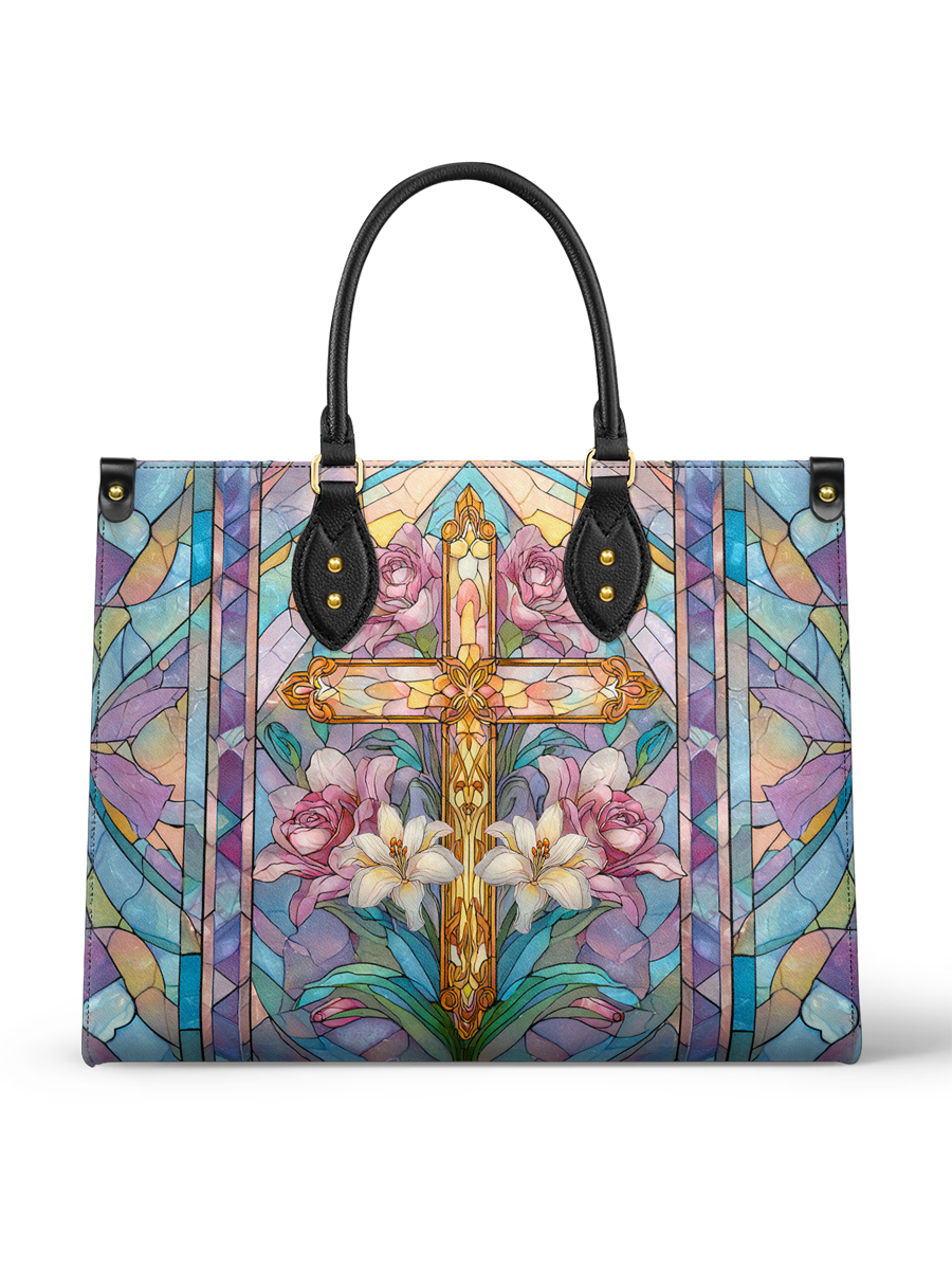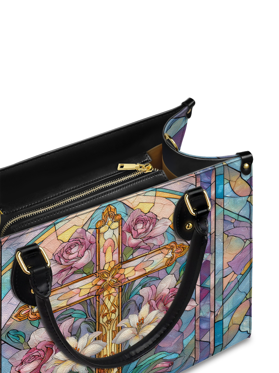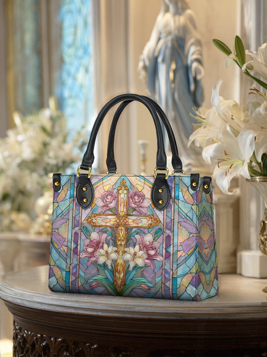 The Floral Cross Radiance Leather Bag showcases a golden cross adorned with lilies and roses, framed in soft pastel stained glass. Symbolizing purity, love, and resurrection, this sacred artwork reflects hope and divine grace in every detail.