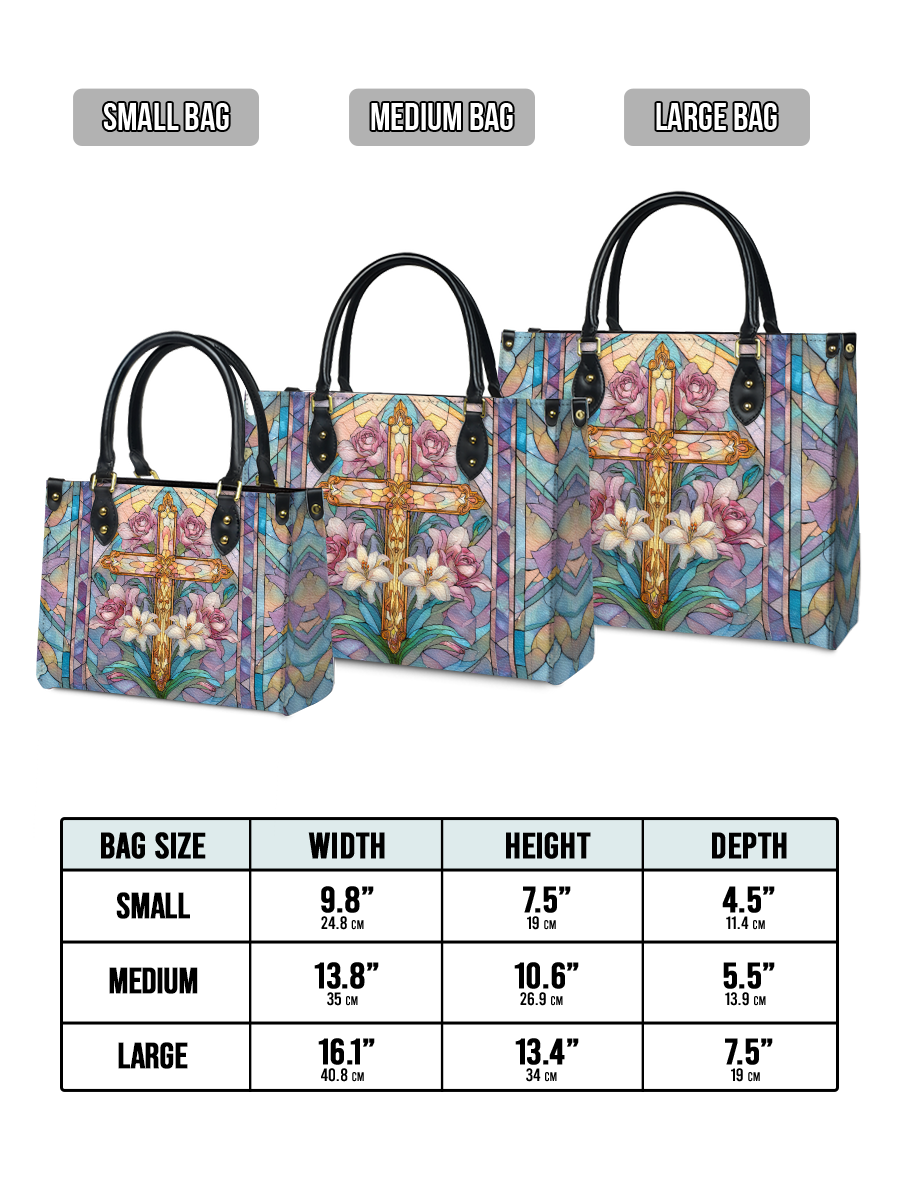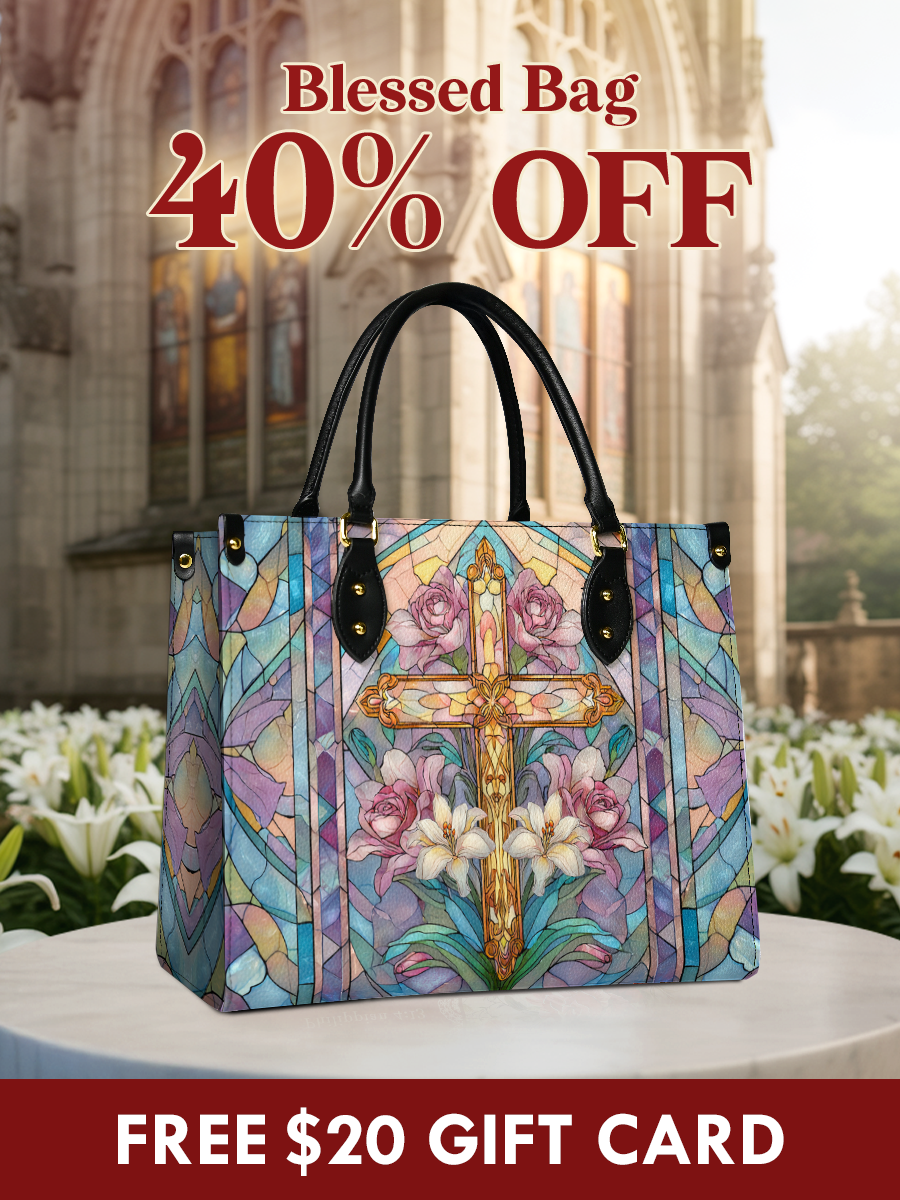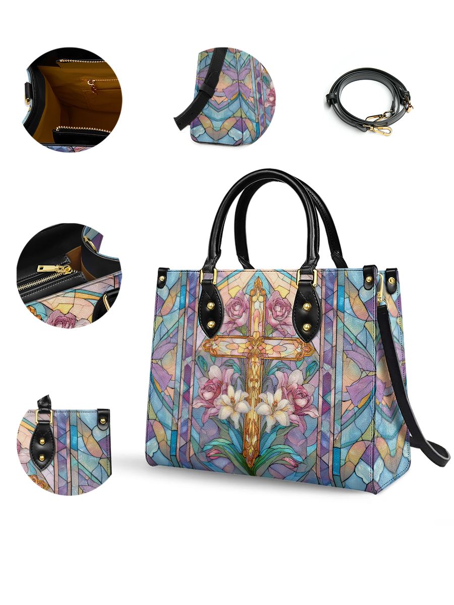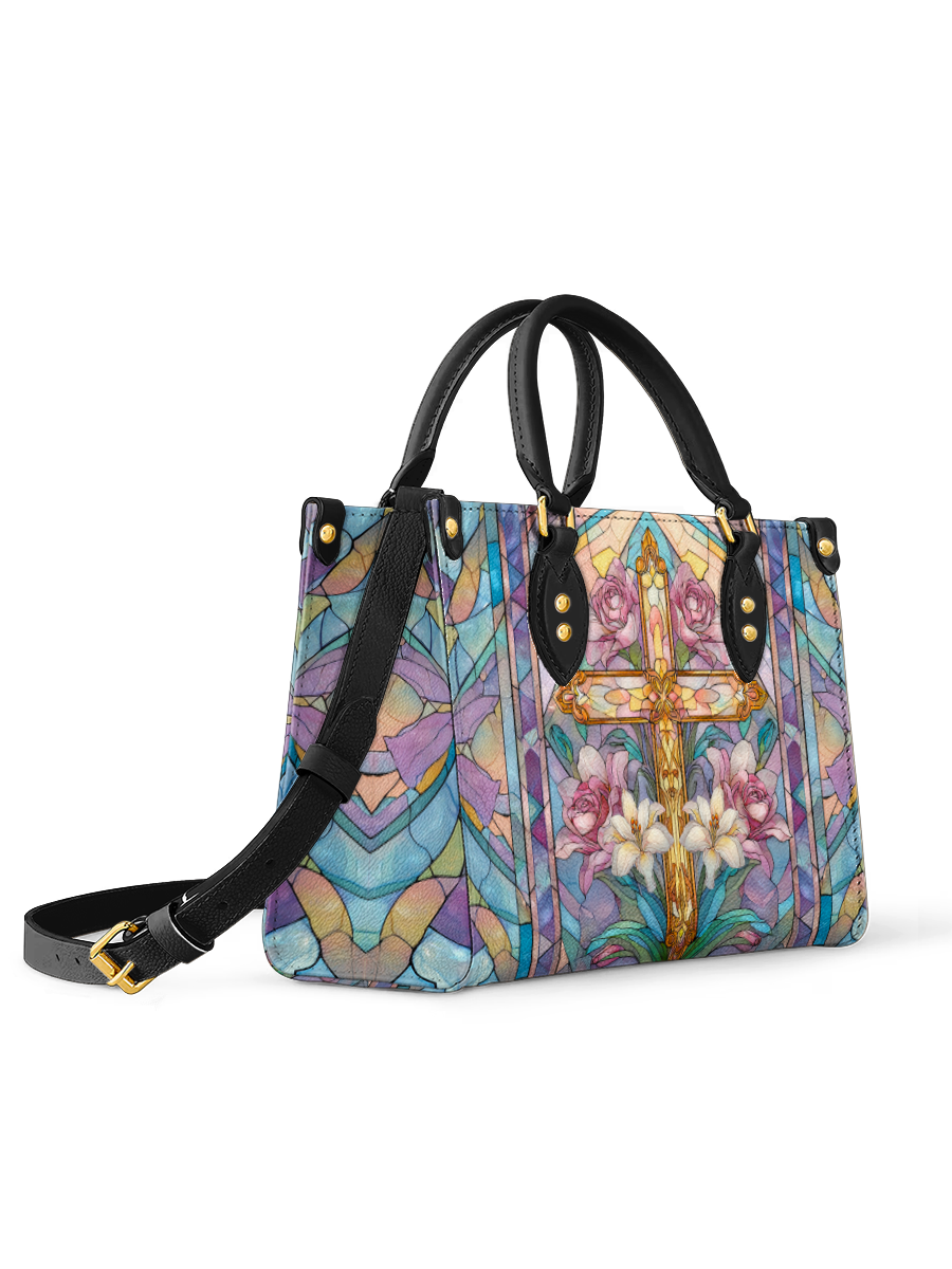 The Floral Cross Radiance Leather Bag showcases a golden cross adorned with lilies and roses, framed in soft pastel stained glass. Symbolizing purity, love, and resurrection, this sacred artwork reflects hope and divine grace in every detail.