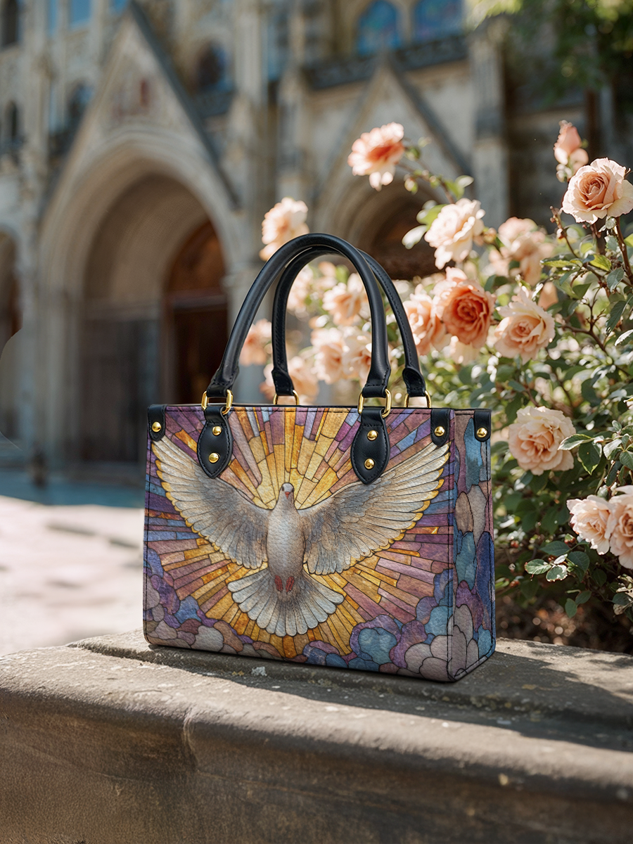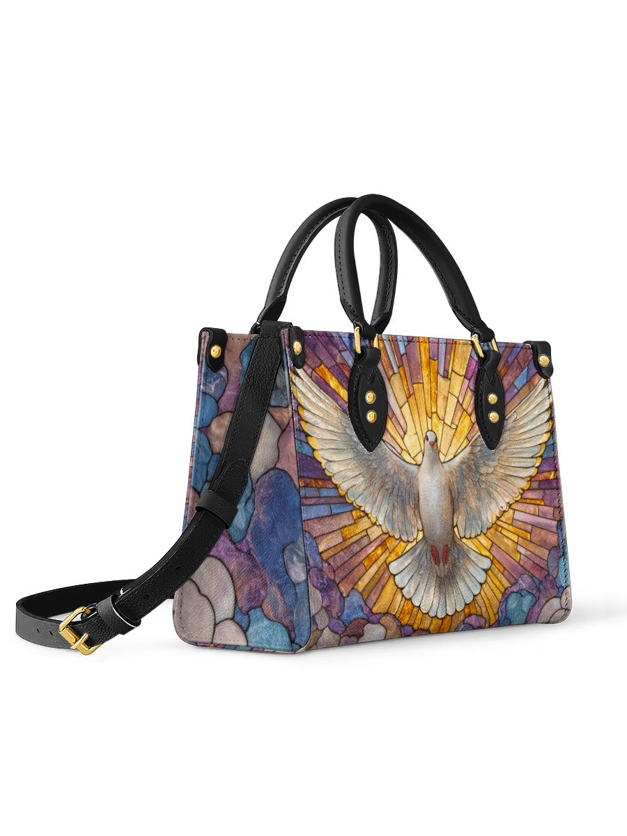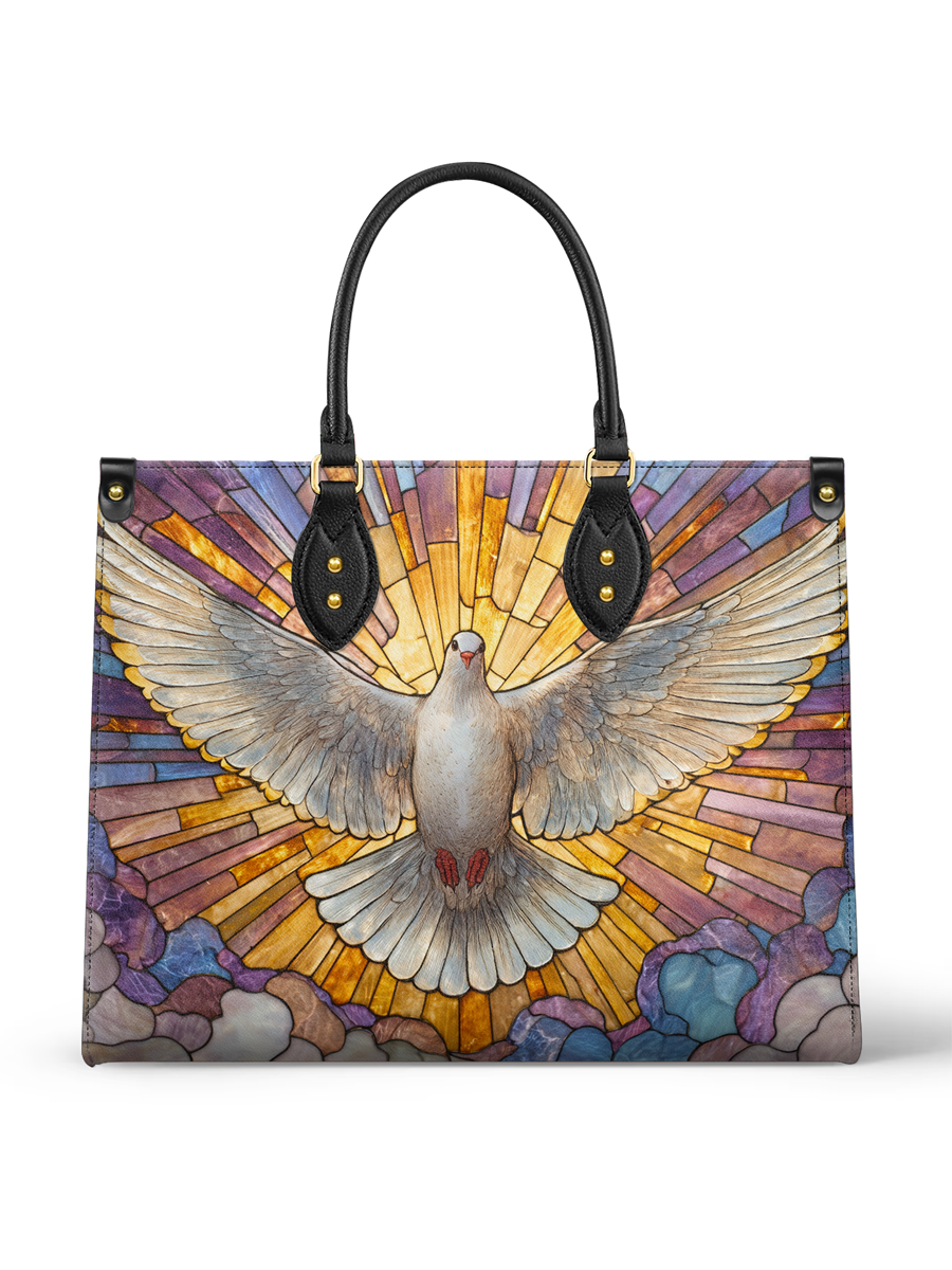 The Holy Dove Radiance Leather Bag depicts the Holy Spirit as a radiant dove, wings outstretched against golden beams and stained glass brilliance. A timeless Christian symbol of peace, purity, and divine presence, the design inspires faith and serenity in every step.
