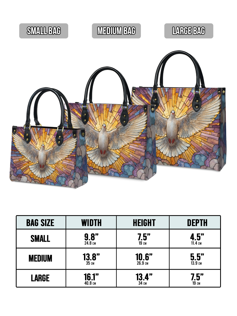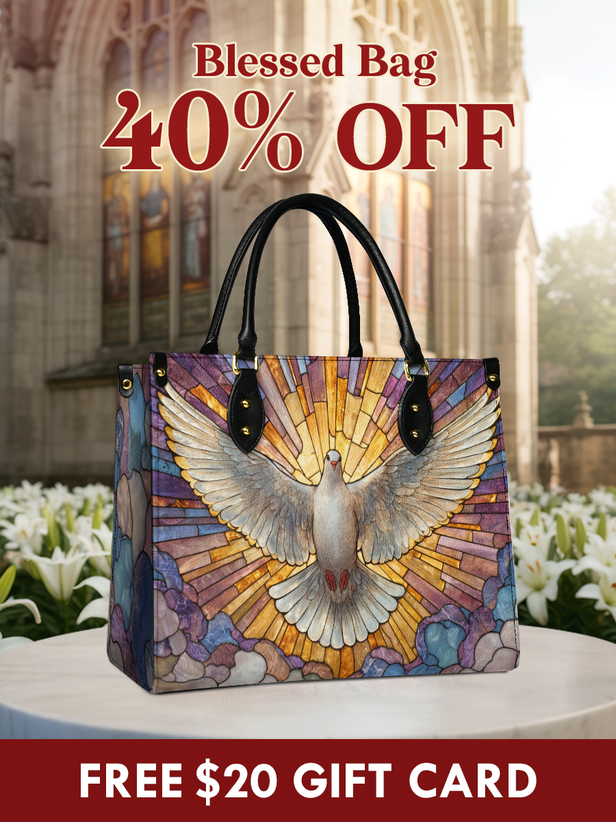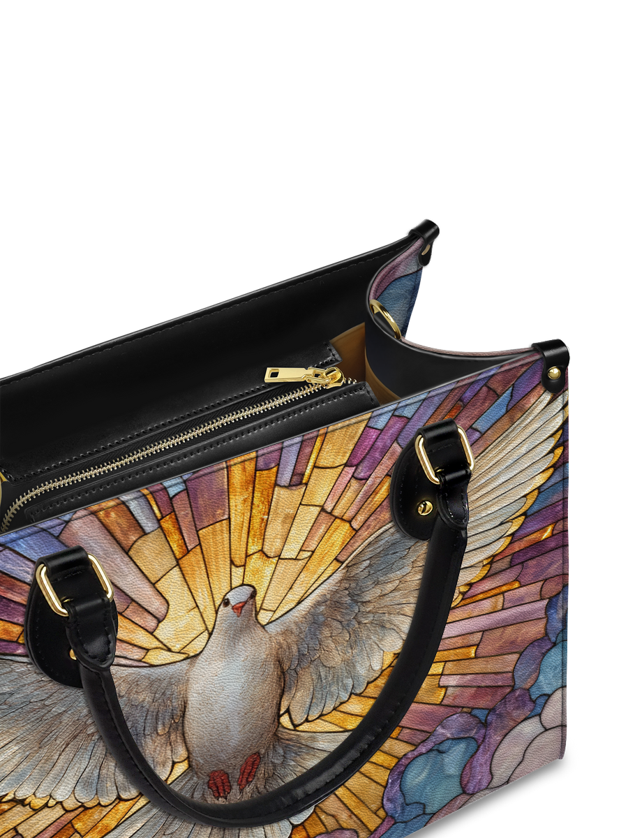 The Holy Dove Radiance Leather Bag depicts the Holy Spirit as a radiant dove, wings outstretched against golden beams and stained glass brilliance. A timeless Christian symbol of peace, purity, and divine presence, the design inspires faith and serenity in every step.