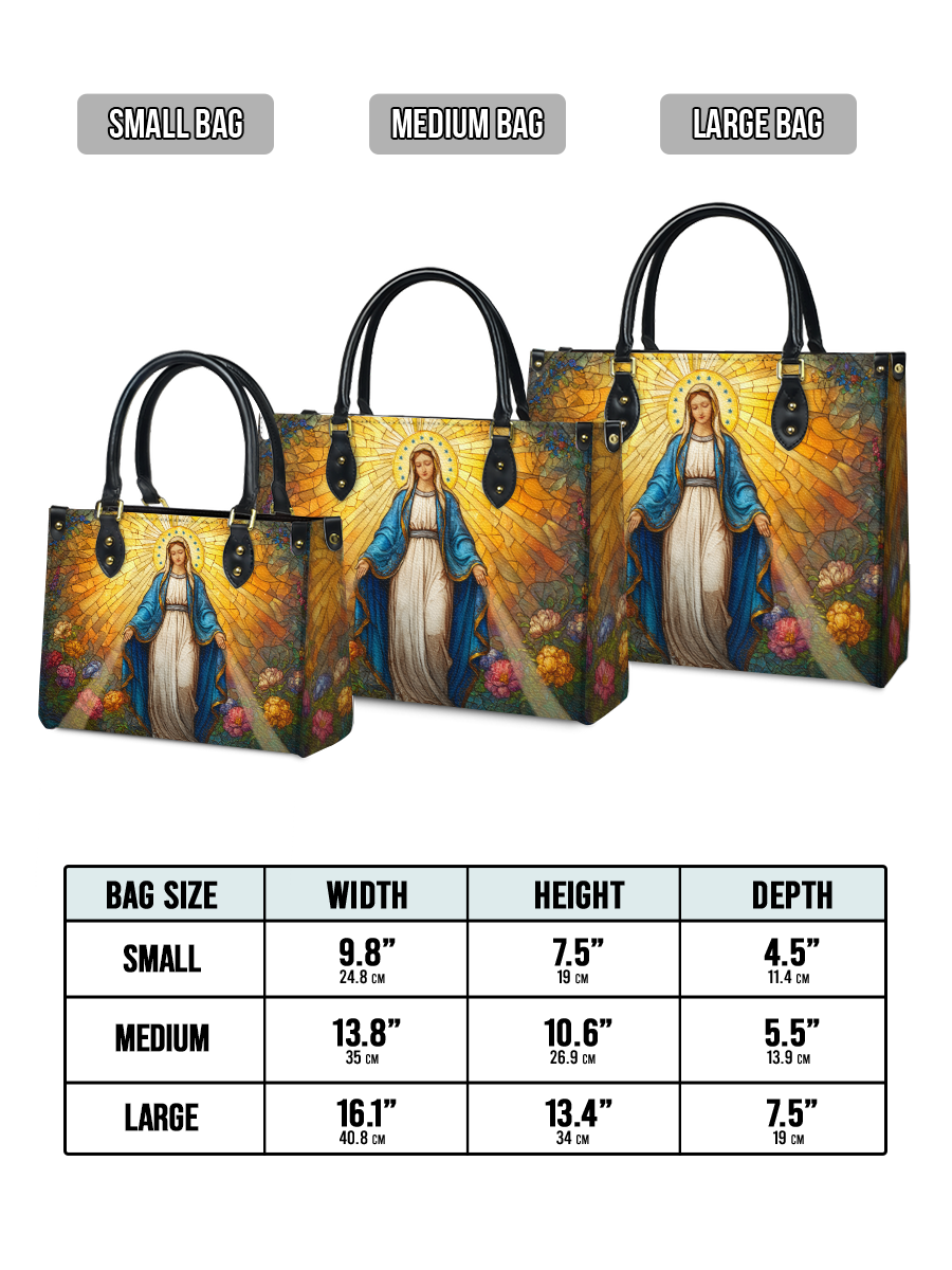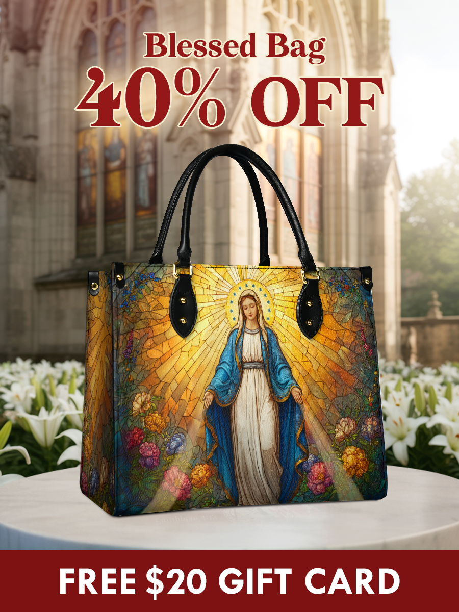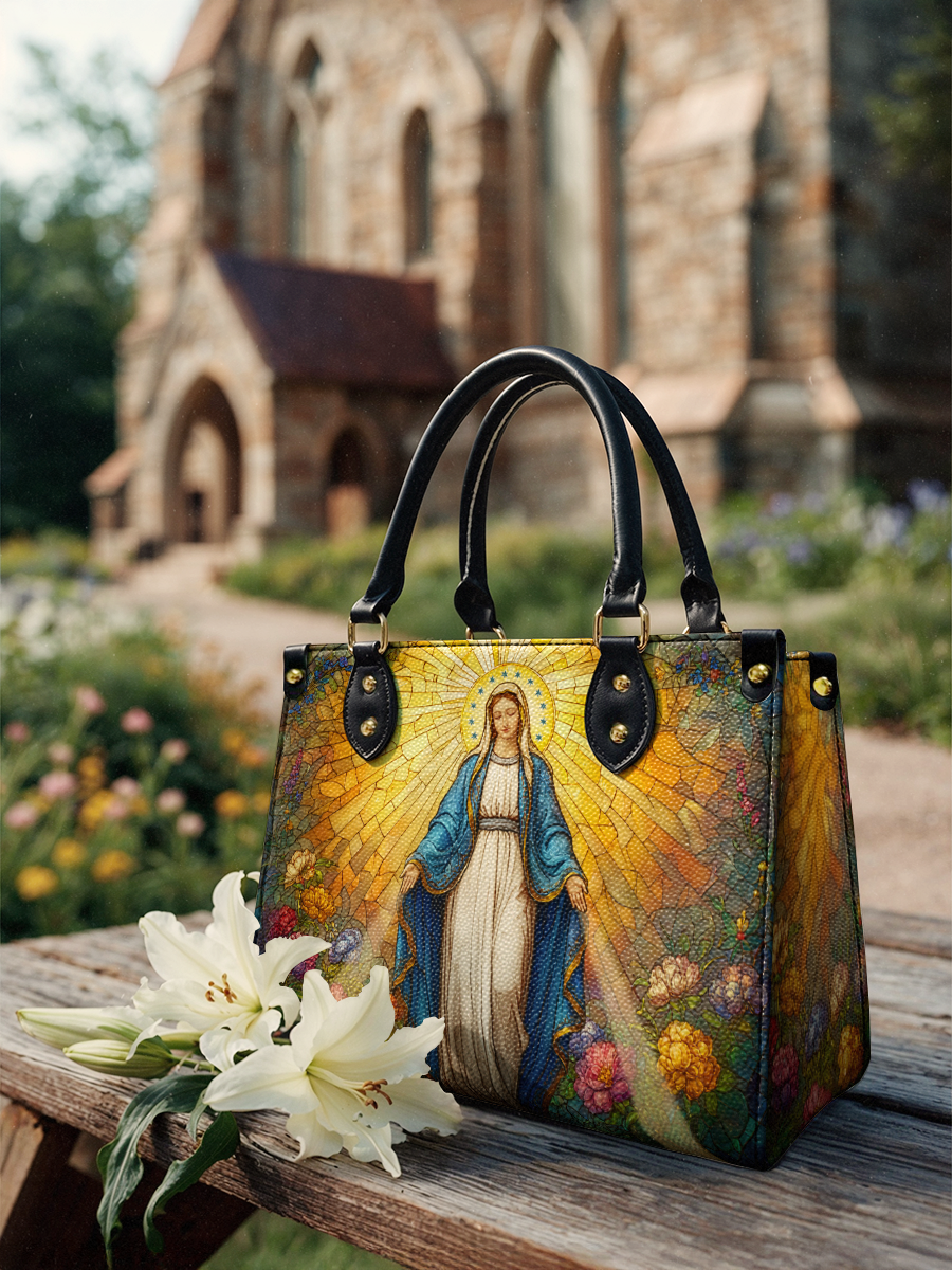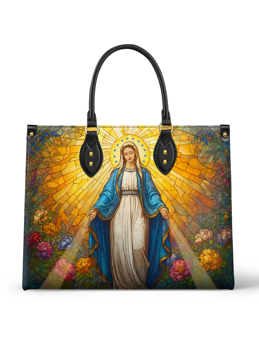 The Immaculate Light Leather Bag honors Our Lady of Grace, radiant in blue and white, surrounded by golden beams that shine over a garden of blossoms. The stained glass artistry reflects purity, serenity, and heavenly intercession — a reminder of her guiding presence and maternal love.