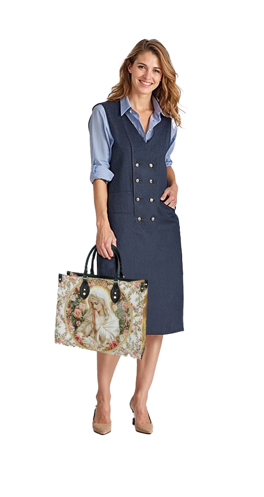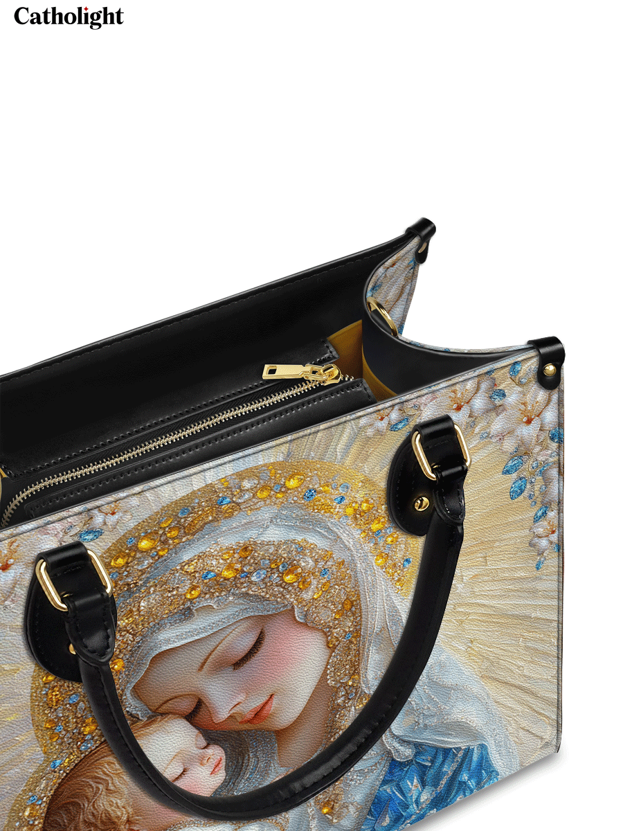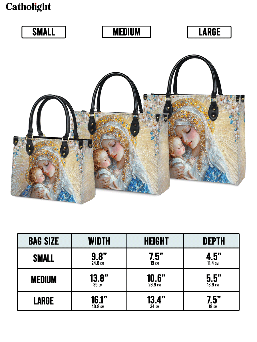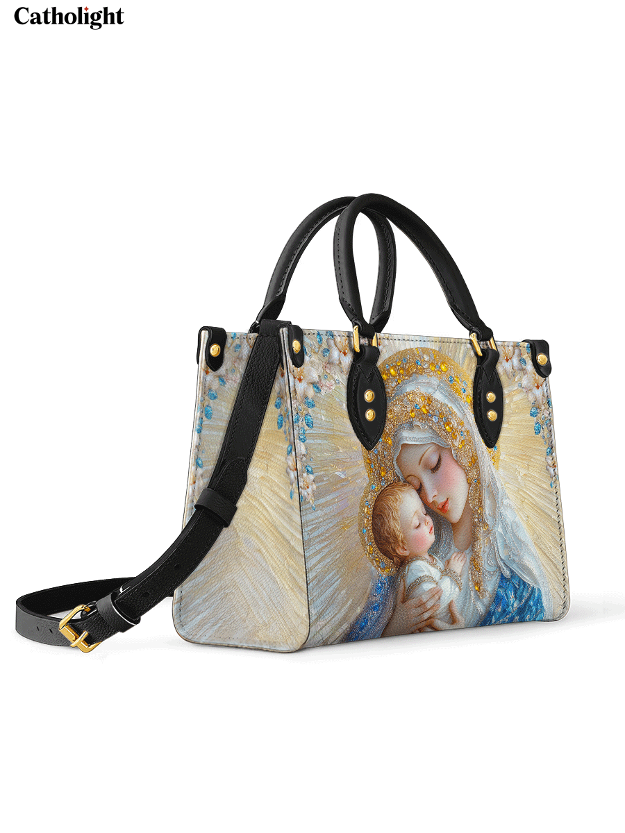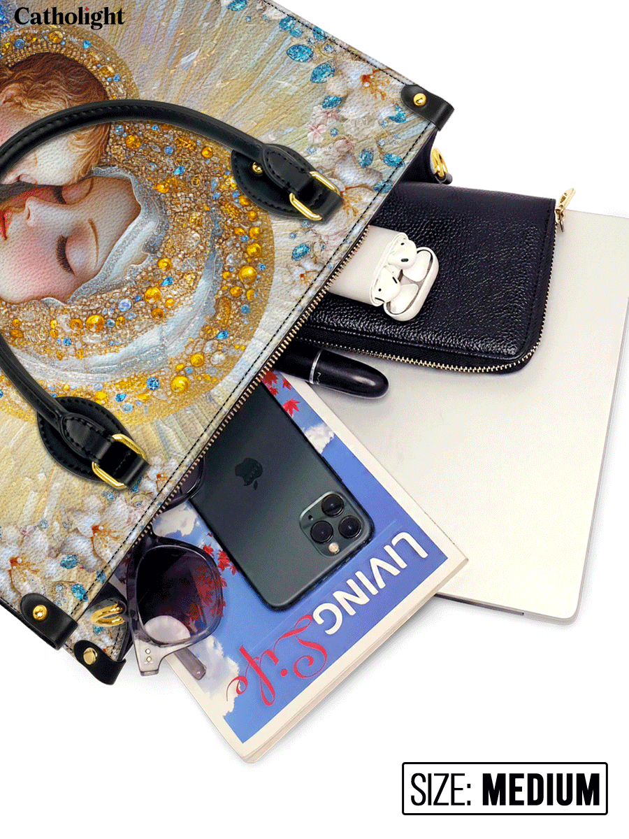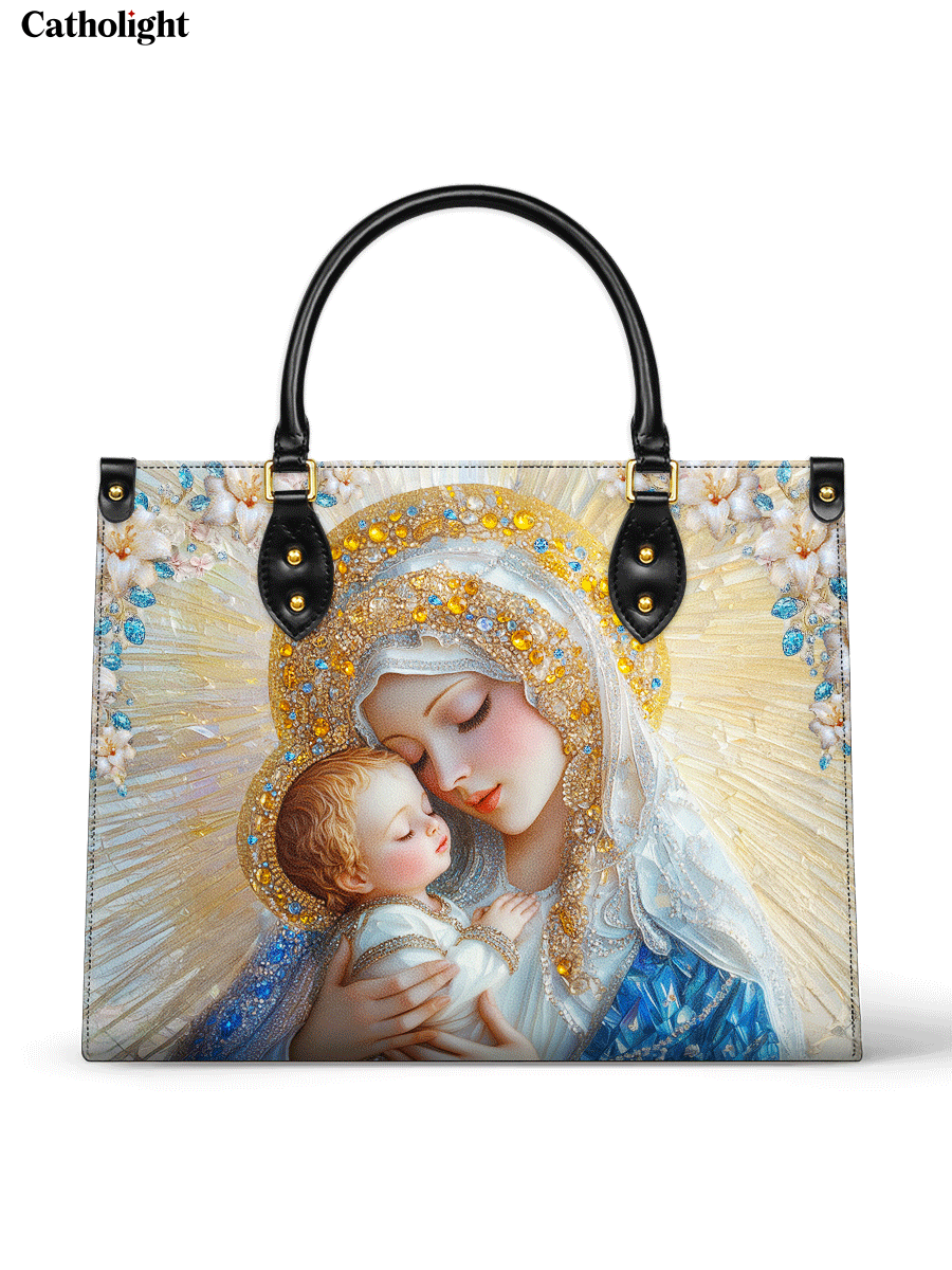 This beautifully crafted leather tote bag features a radiant and detailed depiction of the Virgin Mary cradling the Infant Jesus, symbolizing the ultimate love, purity, and divine protection. Encircled by shimmering golden halos and adorned with intricate floral embellishments, the artwork conveys a serene yet powerful image of faith and devotion. The soft blue and white tones, complemented by delicate golden accents, create an ethereal aura that evokes grace and timeless spirituality.