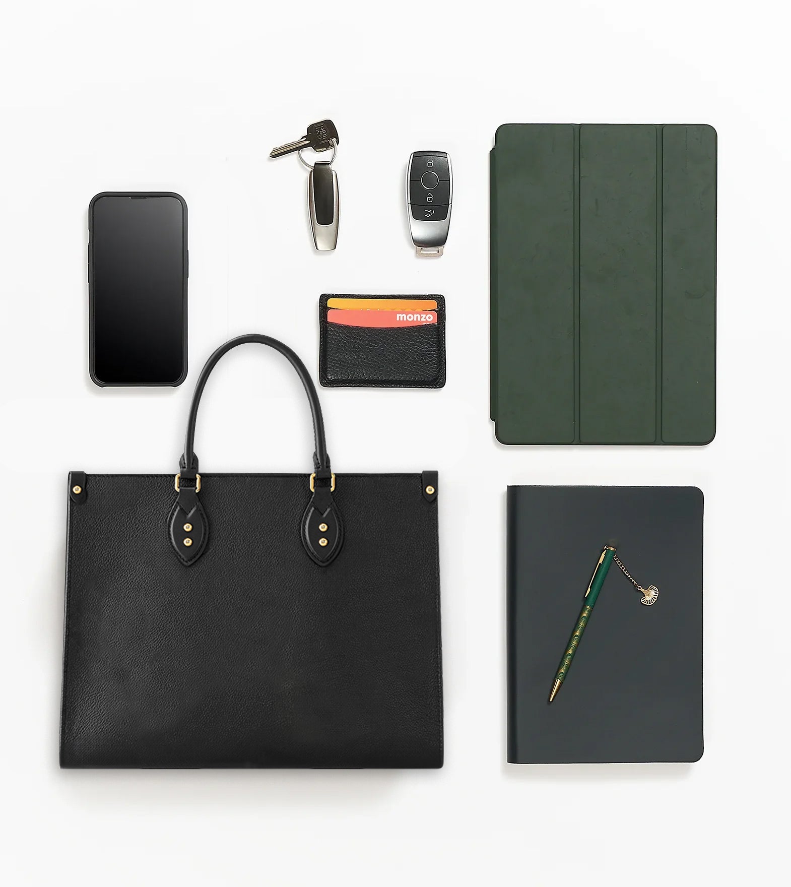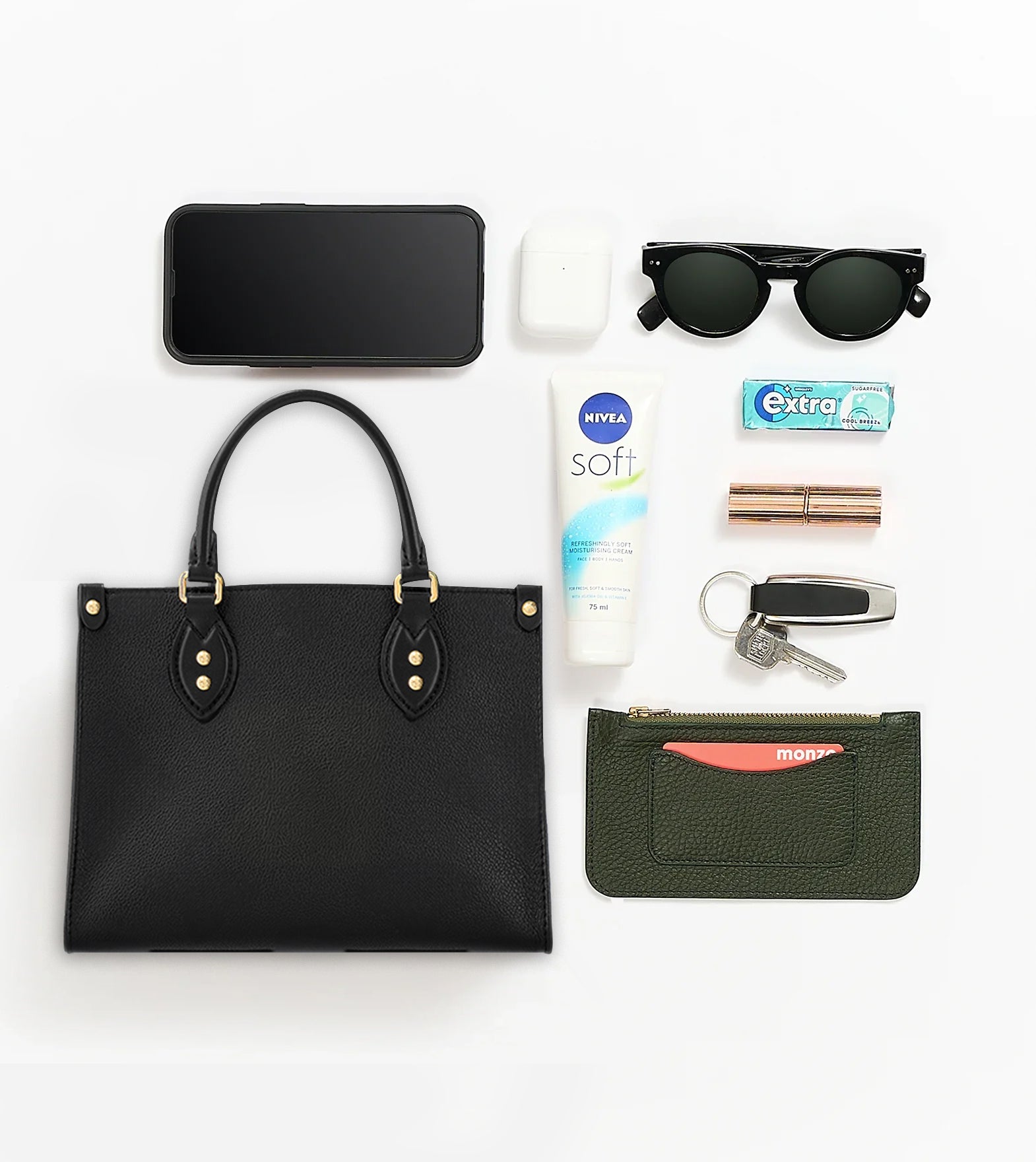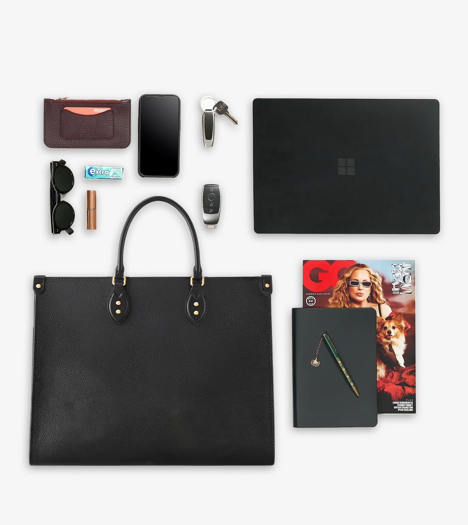 LARGE (16.1" x 13.4" x 7.5")The spacious option for those on the go. It holds a 15" laptop, water bottle, purse/wallet, sunglasses, lipstick, keys, phone, magazine, and pen, offering ample space for all your daily essentials.