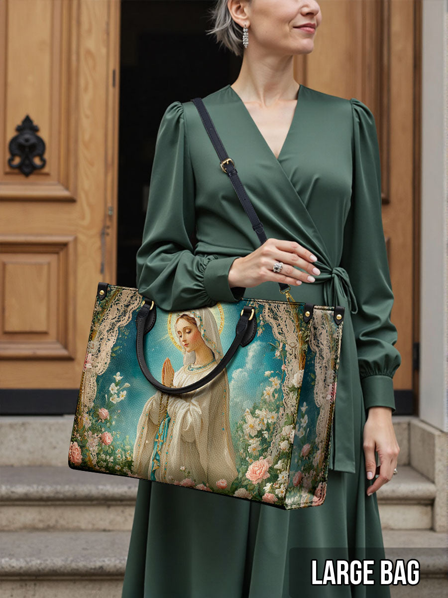 This elegant leather bag showcases a serene image of the Blessed Virgin Mary in prayer, surrounded by delicate lace-like details and blooming roses. Her gentle expression and radiant halo symbolize her purity, grace, and loving intercession. The soft pastel hues and lush floral background evoke a sense of peace, devotion, and divine beauty, making this leather bag a timeless representation of faith and love for Our Lady.