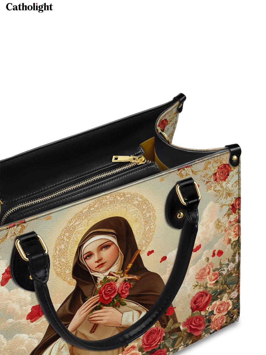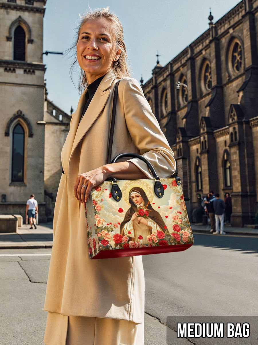 This exquisite leather bag honors Saint Thérèse of Lisieux, lovingly known as "The Little Flower." The artwork features Saint Thérèse holding a delicate rose, symbolizing her promise to send “a shower of roses” as blessings from heaven. Encircled by blooming roses and gentle clouds, her serene expression reflects her deep devotion, humility, and unwavering faith. The golden halo accentuates her sanctity, creating a radiant and spiritually uplifting image. This leather bag is a beautiful tribute to her message of love and trust in God.