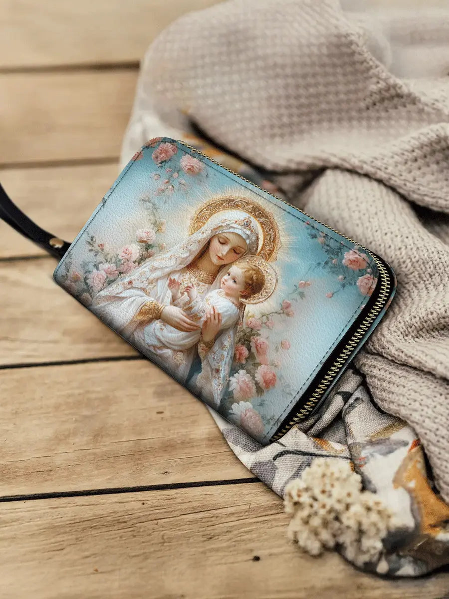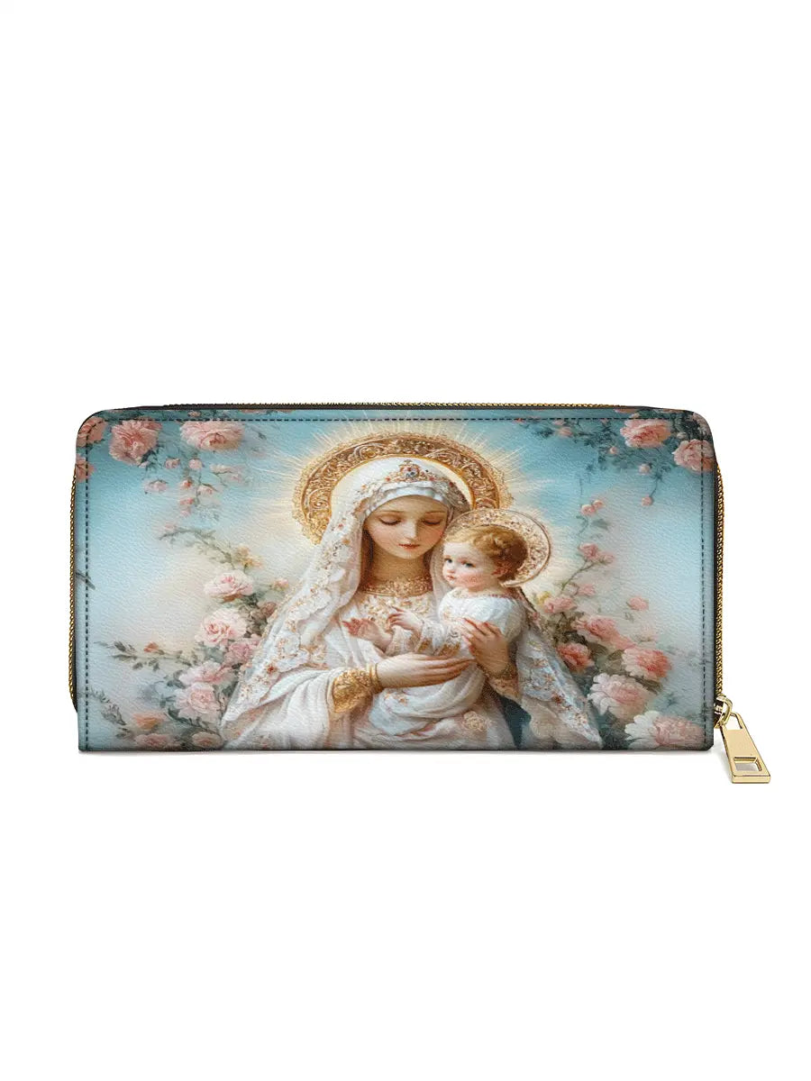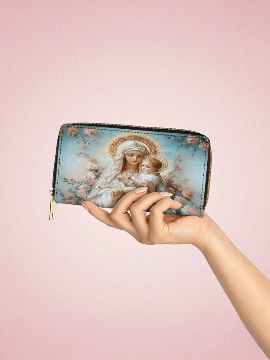 This beautifully designed wallet is a symbol of divine love and celestial protection, featuring an ethereal depiction of Mary and Baby Jesus. Crafted with exquisite attention to detail, the artwork showcases the Blessed Mother’s tender embrace, radiating warmth, serenity, and boundless compassion. The soft sky-blue background, adorned with delicate blooming roses, enhances the sense of peace and purity, while the golden halo encircling Mary’s head adds a touch of heavenly grace.