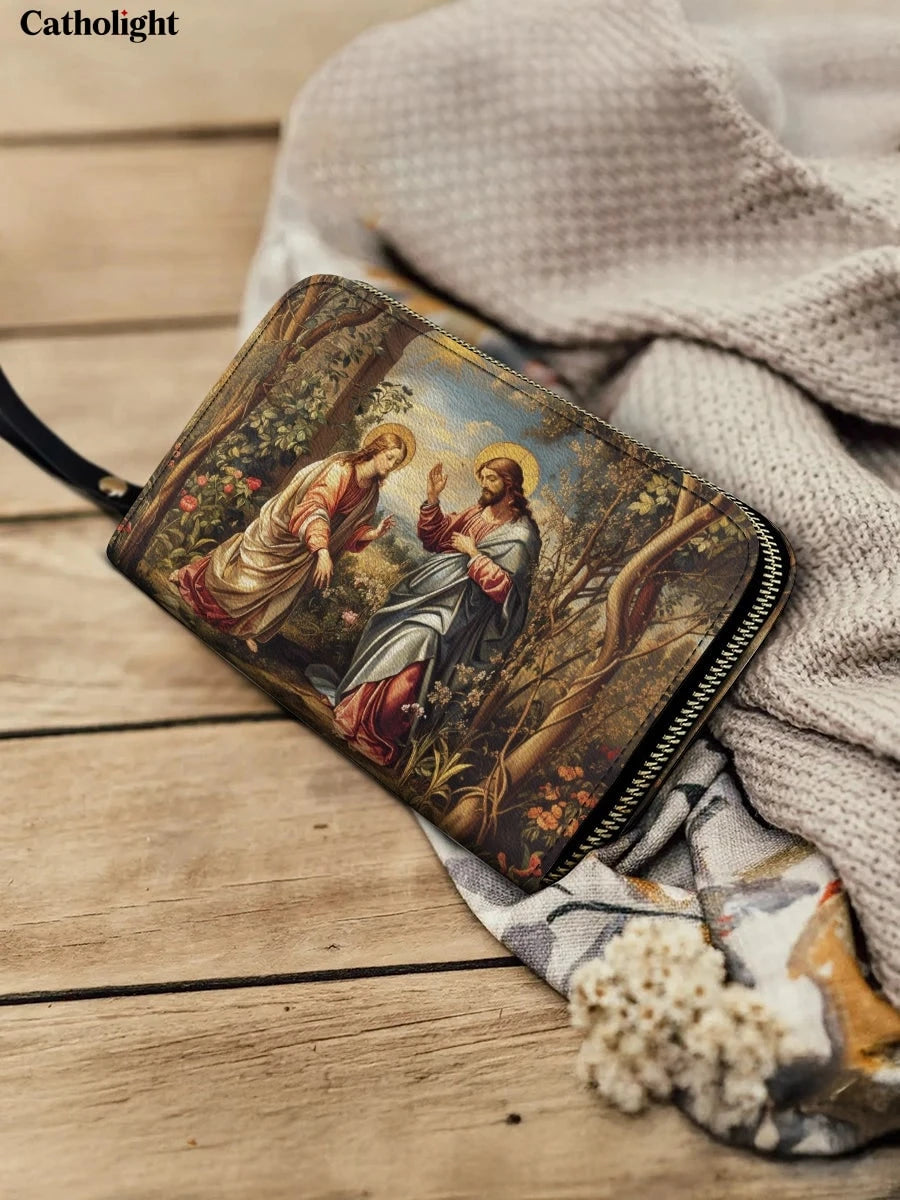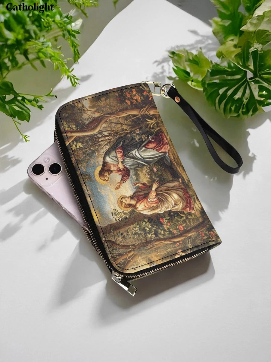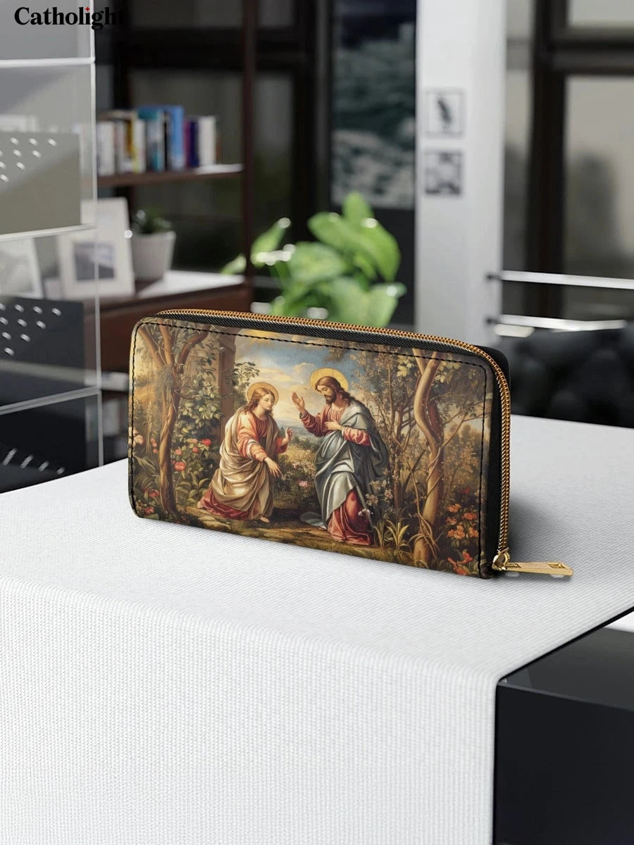 This exquisite wallet features a tender and inspiring depiction of the encounter between Christ and Mary Magdalene after the Resurrection, a moment known as “Noli Me Tangere.” Set within a lush garden filled with blooming flowers and serene natural beauty, the scene captures the profound spiritual connection between the risen Christ and Mary Magdalene.