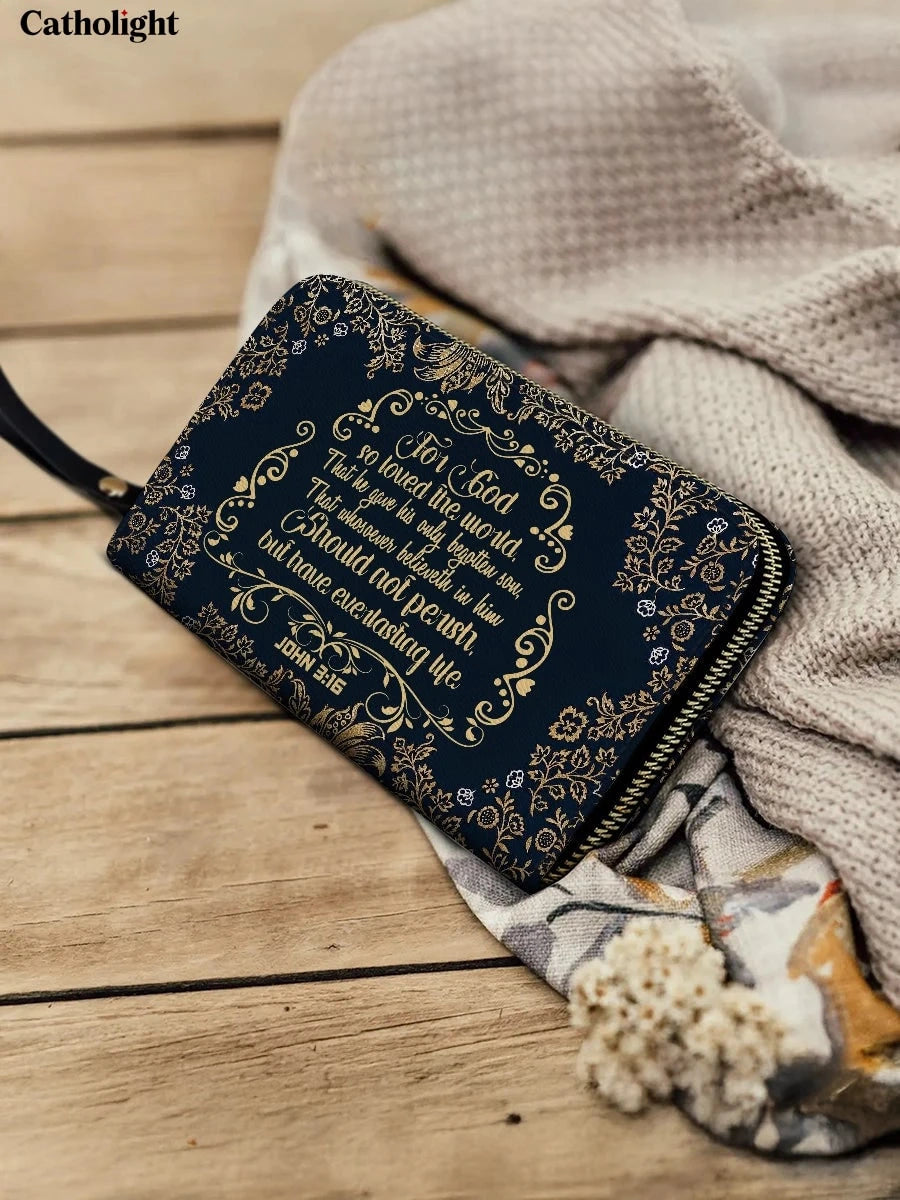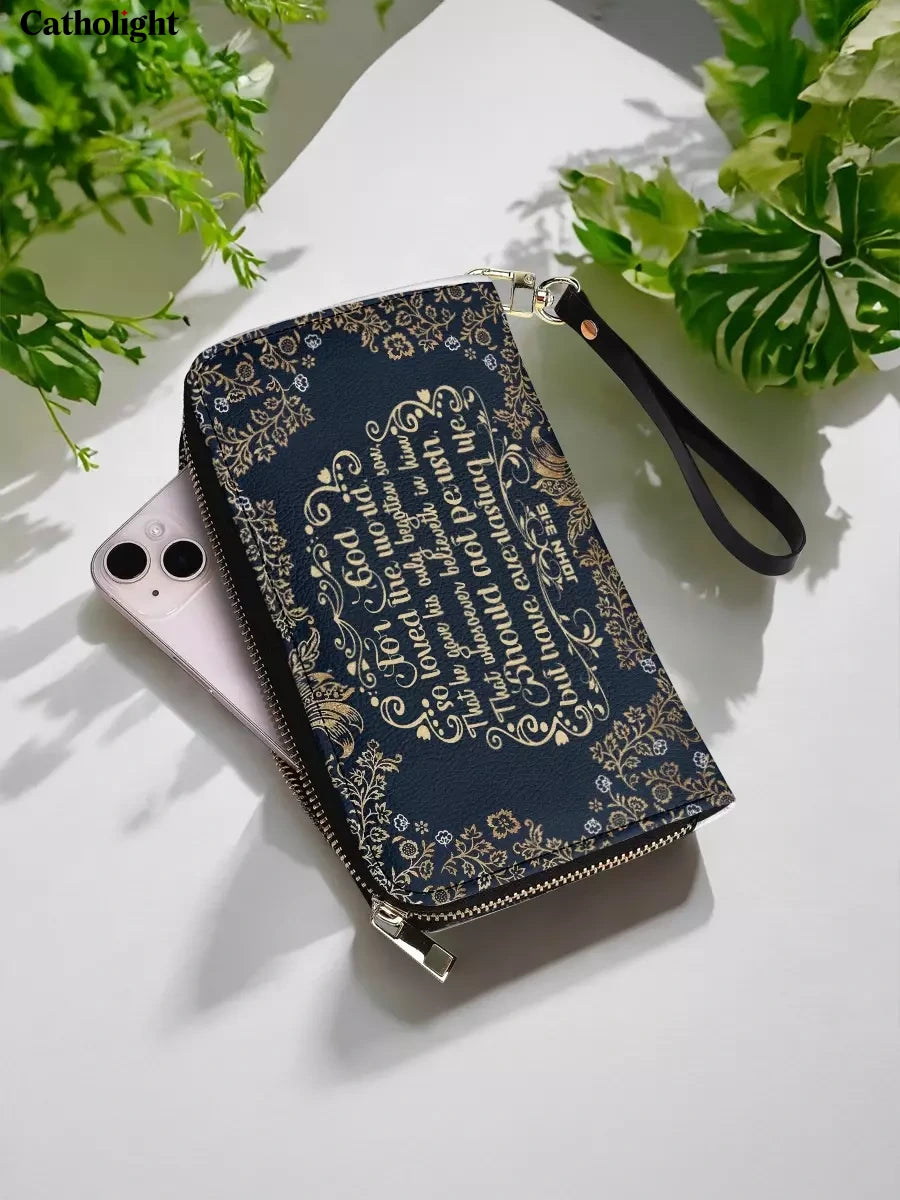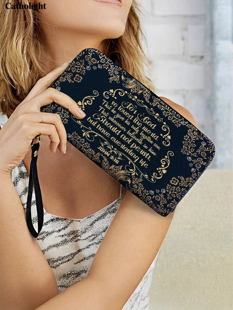 This inspiring wallet features the timeless verse from John 3:16, beautifully rendered in elegant golden script on a rich navy blue background. Encased within a delicate floral and scrollwork design, the words radiate faith, hope, and love. The intricate gold detailing adds a touch of sophistication and charm, creating a piece that is both spiritually meaningful and visually stunning.