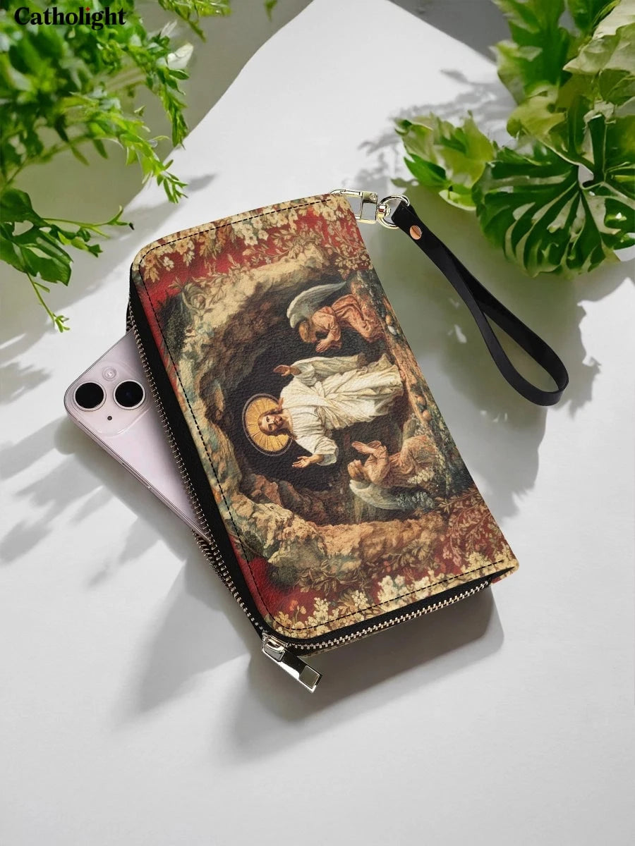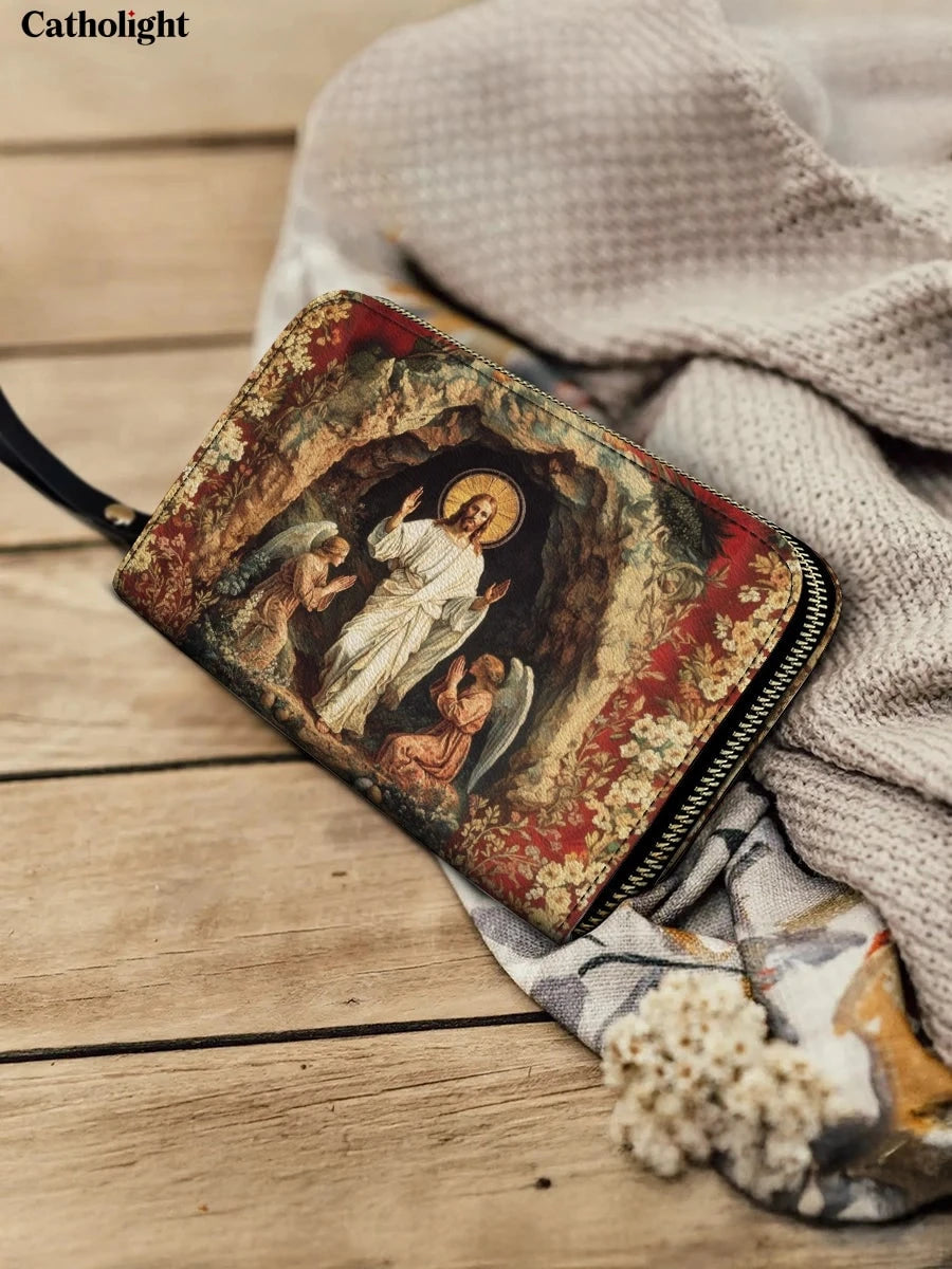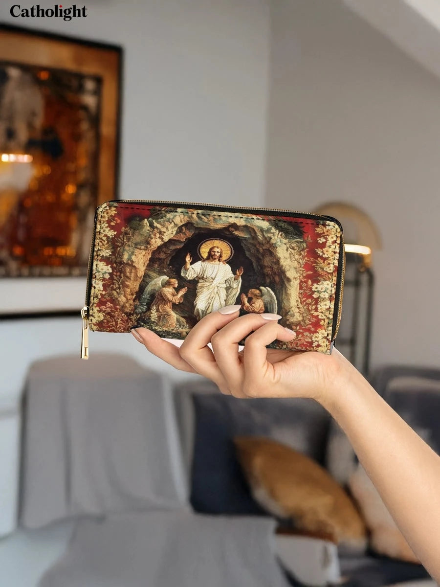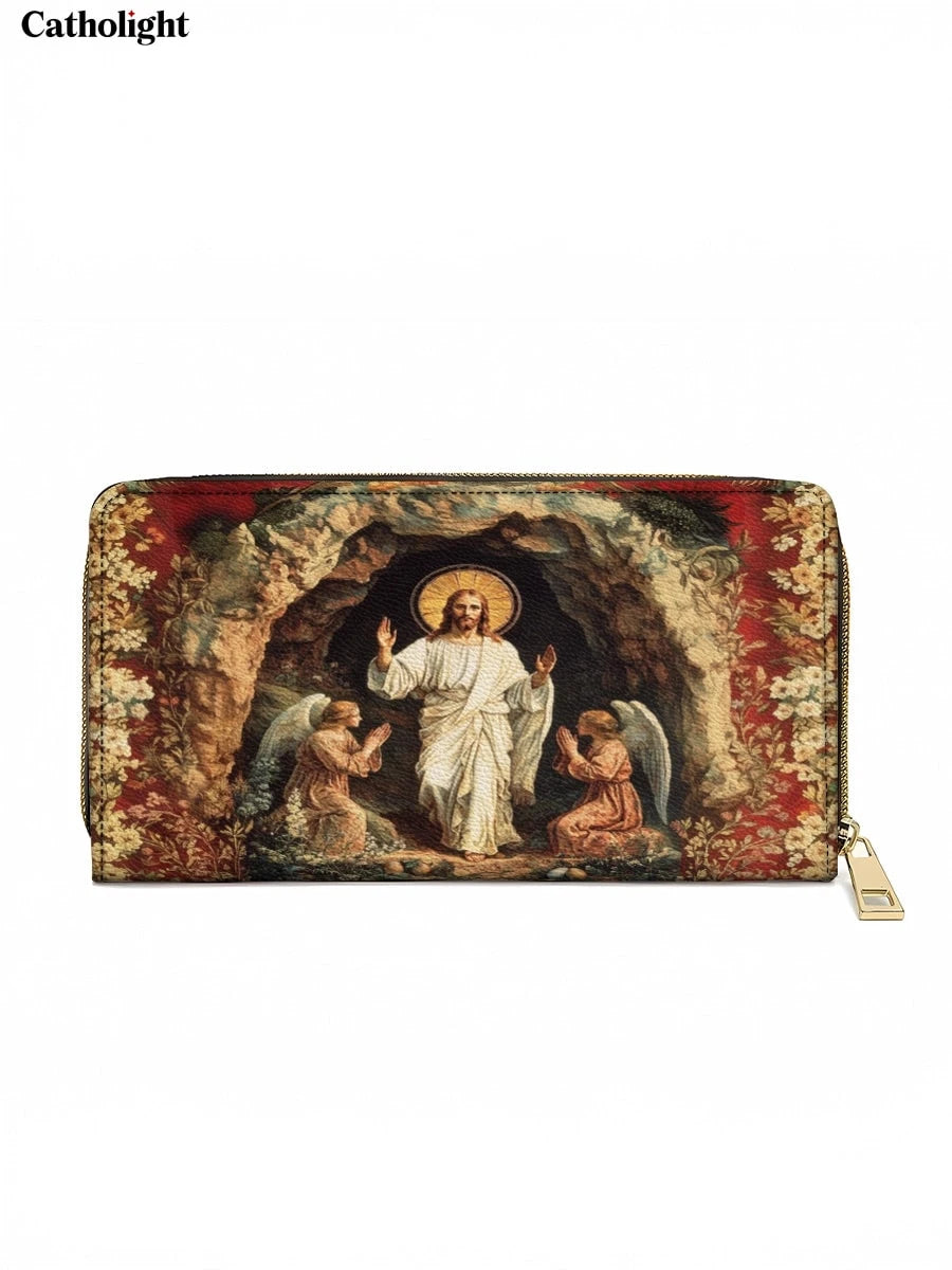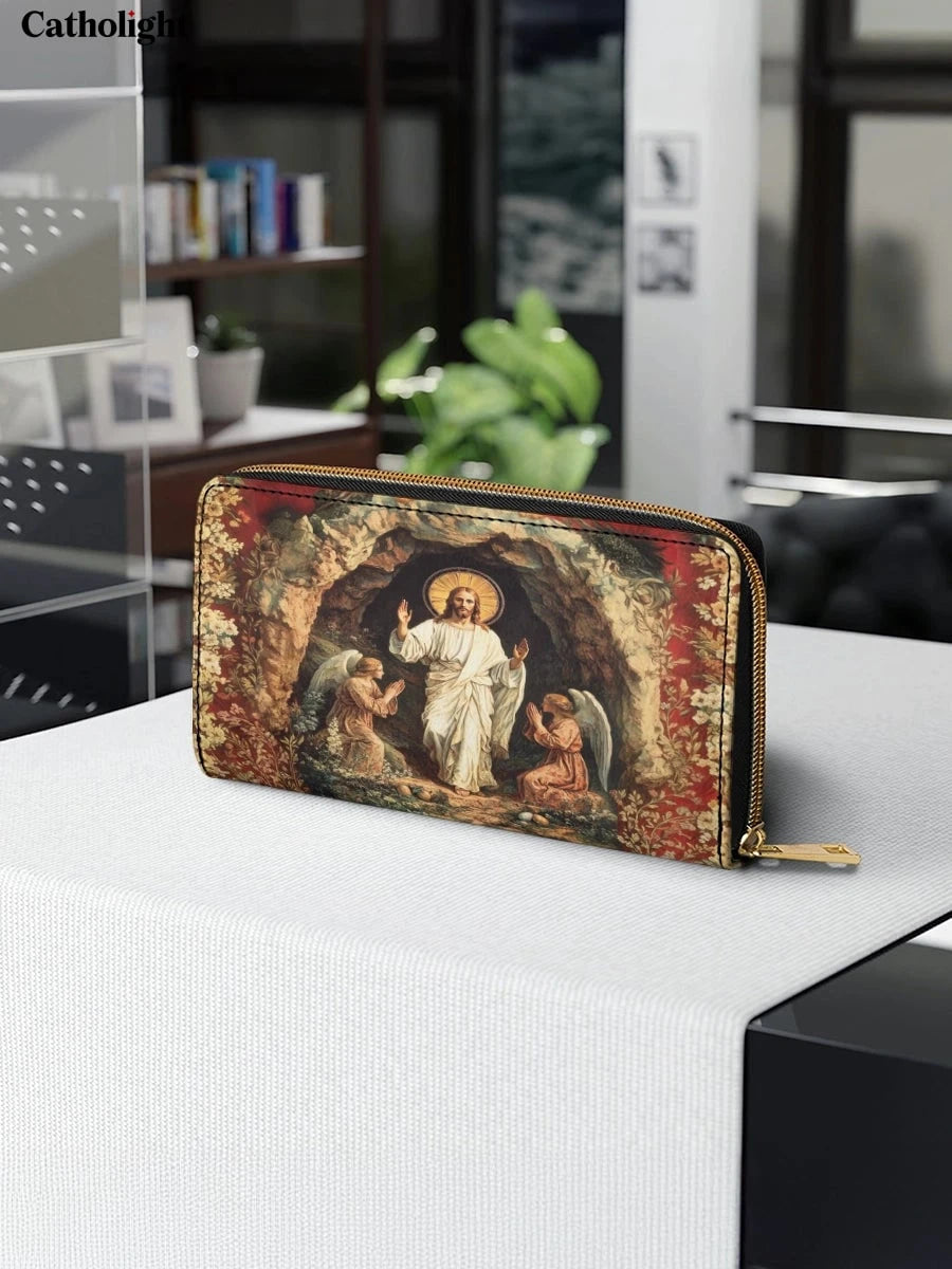 Surrounded by an intricate floral border in rich red and gold tones, the artwork evokes a sense of majesty and grace, making this wallet a timeless piece that celebrates the essence of faith and rebirth.
