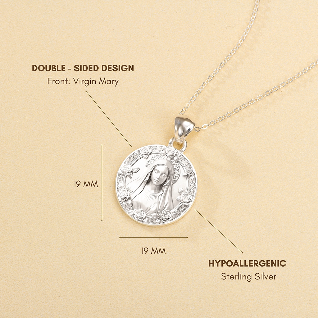 This pendant honors the Blessed Virgin Mary, surrounded by roses, the eternal symbol of purity, love, and devotion. Her serene gaze and flowing veil are delicately engraved, a timeless reminder of her intercession and maternal care.