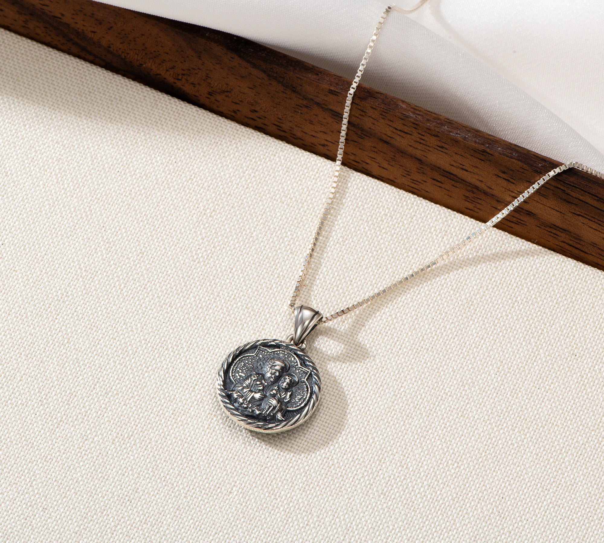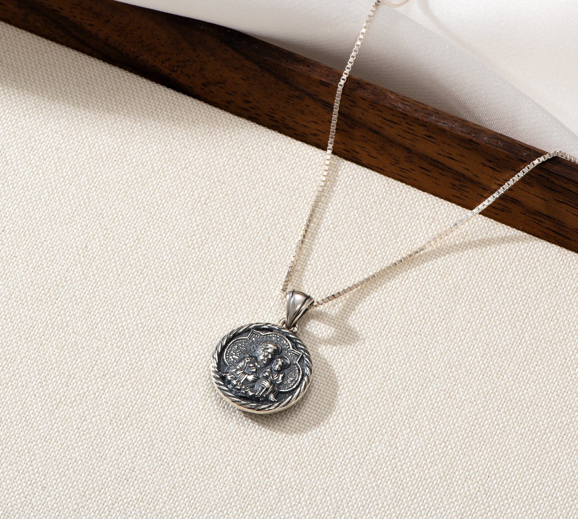 Catholight ST. Joseph and Three Heart Reversible Necklace in Oxidized Sterling Silver