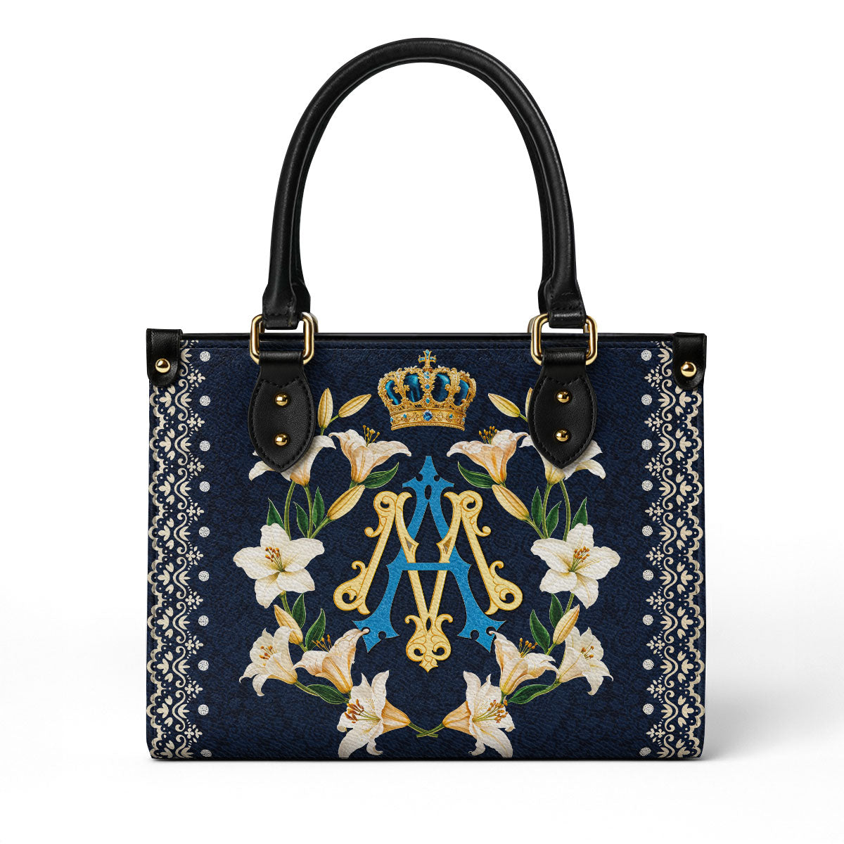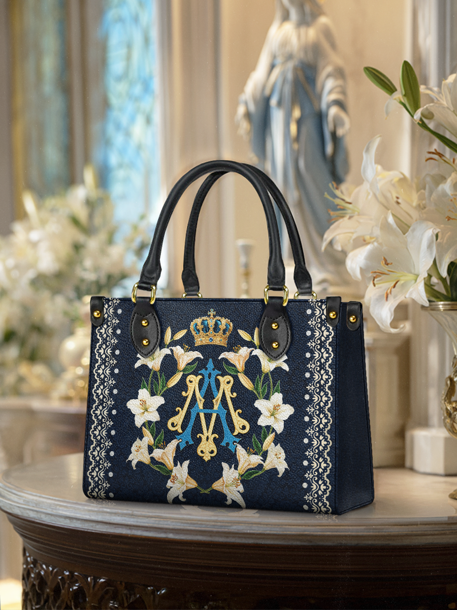 Carrying this bag brings a sense of spiritual connection and grace, a daily expression of devotion to Mary and her virtues. The intricate details of the design, from the regal monogram to the blooming lilies, create a visual masterpiece that resonates deeply with the heart.